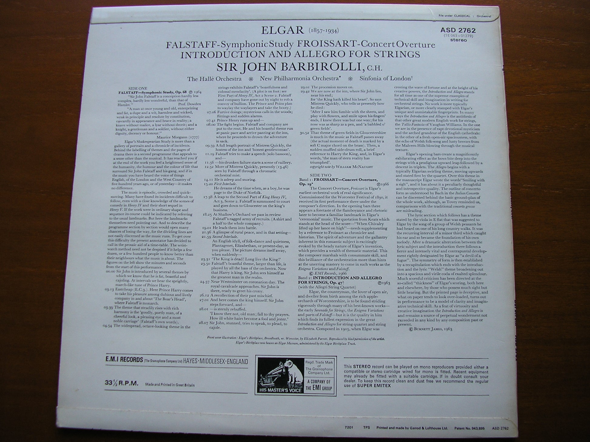 ASD 2762  ELGAR: FALSTAFF / FROISSART / INTRODUCTION & ALLEGRO     SIR JOHN BARBIROLLI / HALLE ORCHESTRA / NEW PHILHARMONIA / SINFONIA OF LONDON