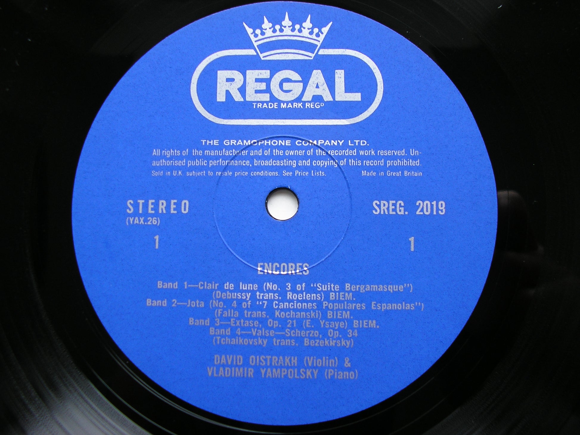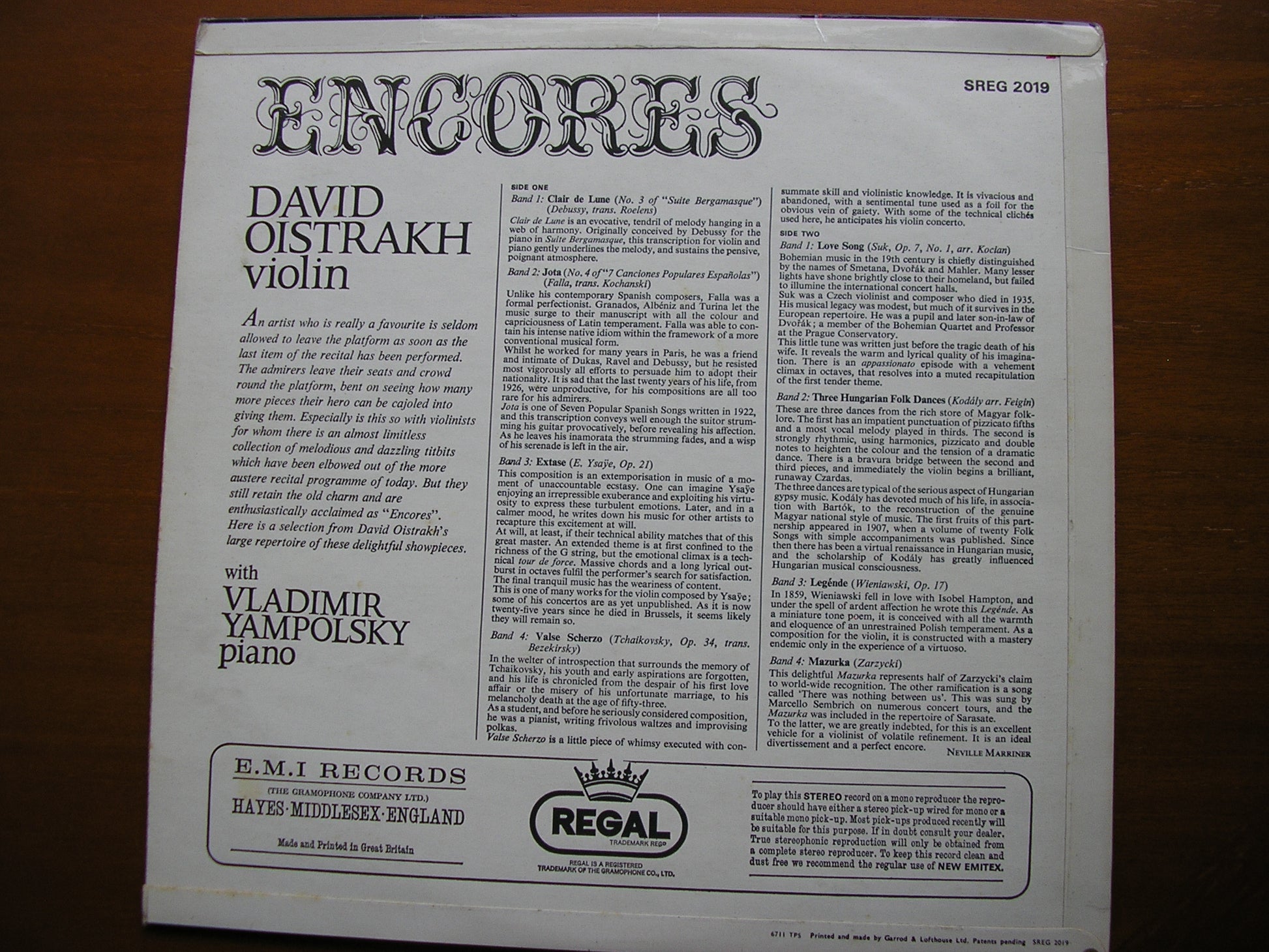 SREG 2019  ENCORES: DEBUSSY / FALLA / YSAYE / TCHAIKOVSKY / WIENIAWSKI / SUK / KODALY / ZARZYCKI        DAVID OISTRAKH / VLADIMIR YAMPOLSKY
