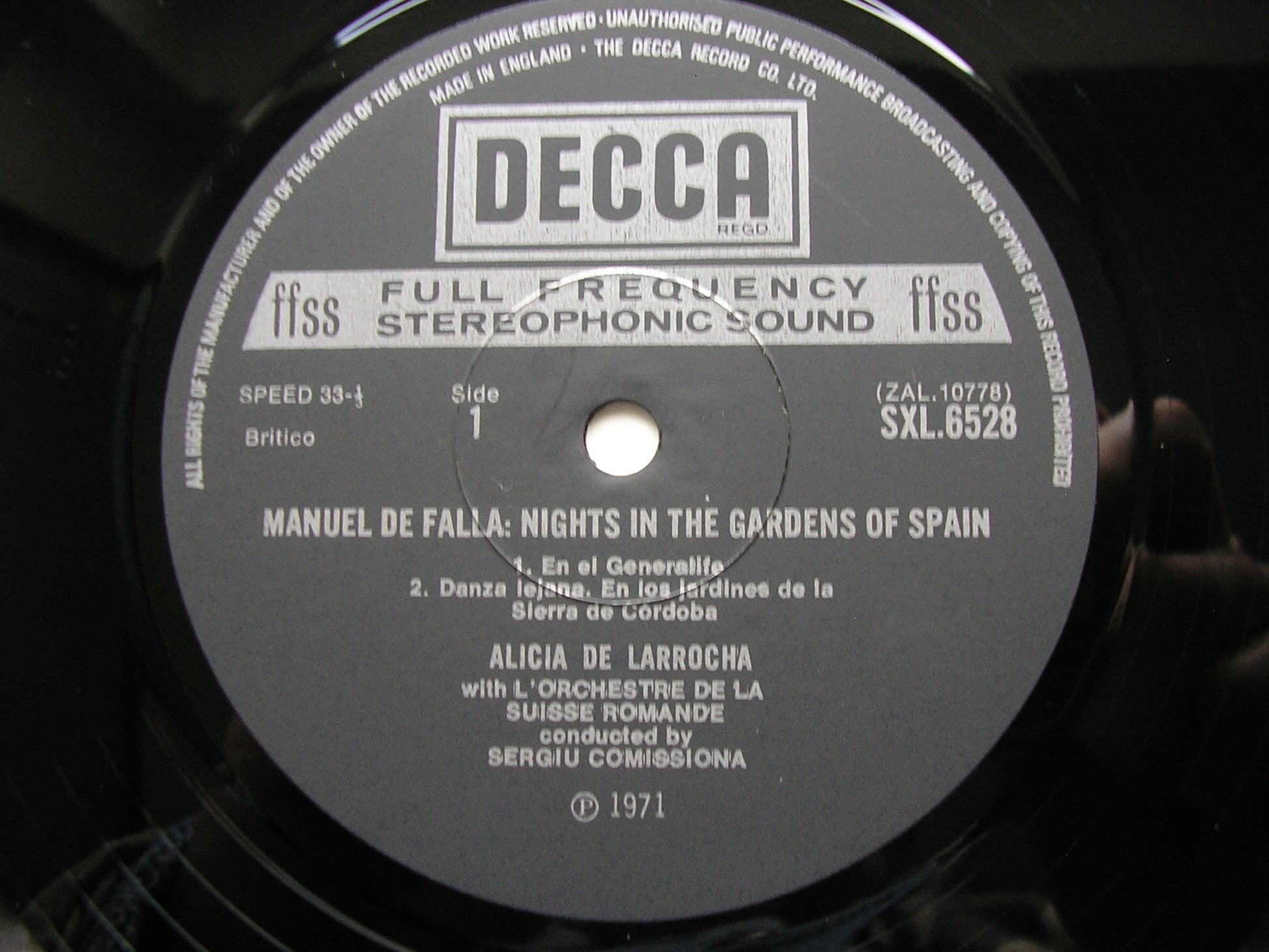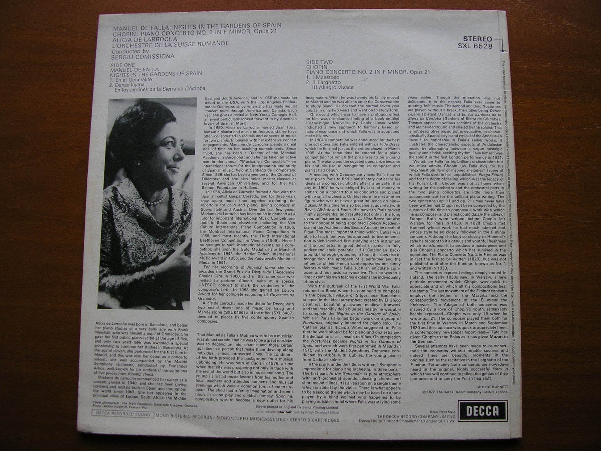 SXL 6528  FALLA: NIGHTS IN THE GARDENS OF SPAIN / CHOPIN: PIANO CONCERTO No. 2     ALICIA DE LARROCHA / SUISSE ROMANDE ORCHESTRA / SERGIU COMISSIONA