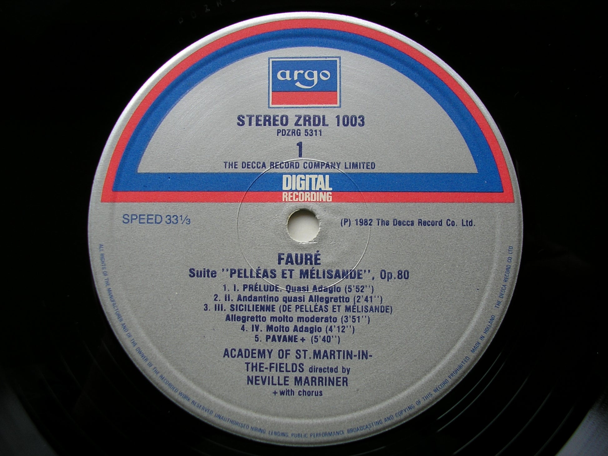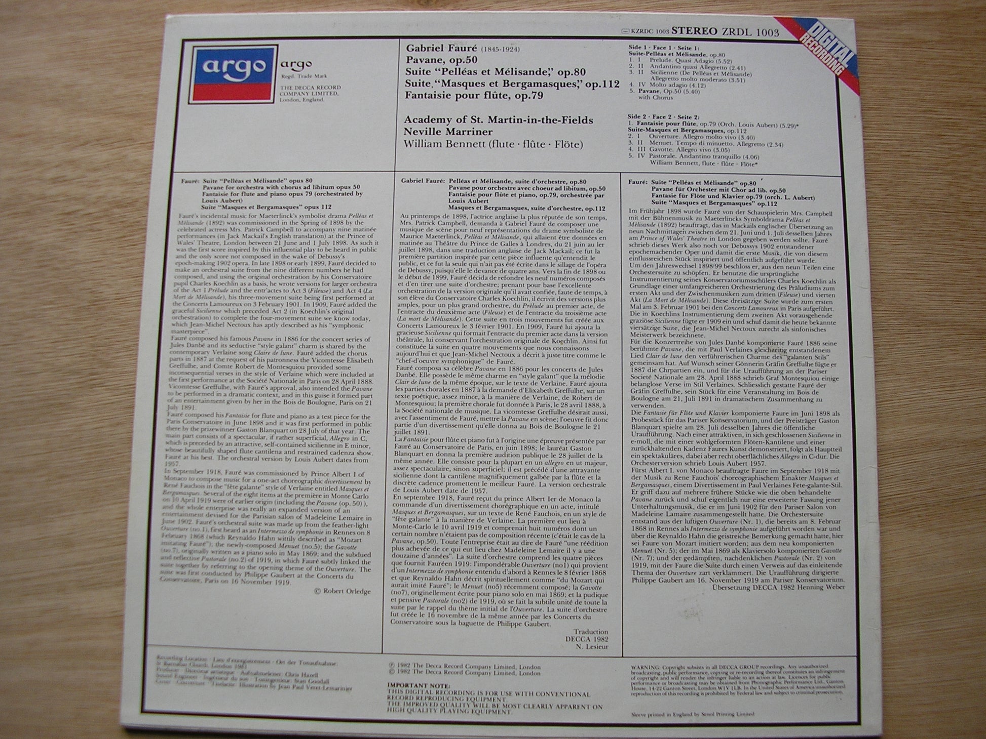 ZRDL 1003  FAURE: PELLEAS & MELISANDE Suite / MASQUES ET BERGAMASQUES / PAVANE / FANTAISIE      WILLIAM BENNETT / ACADEMY OF ST MARTIN IN THE FIELDS / NEVILLE MARRINER