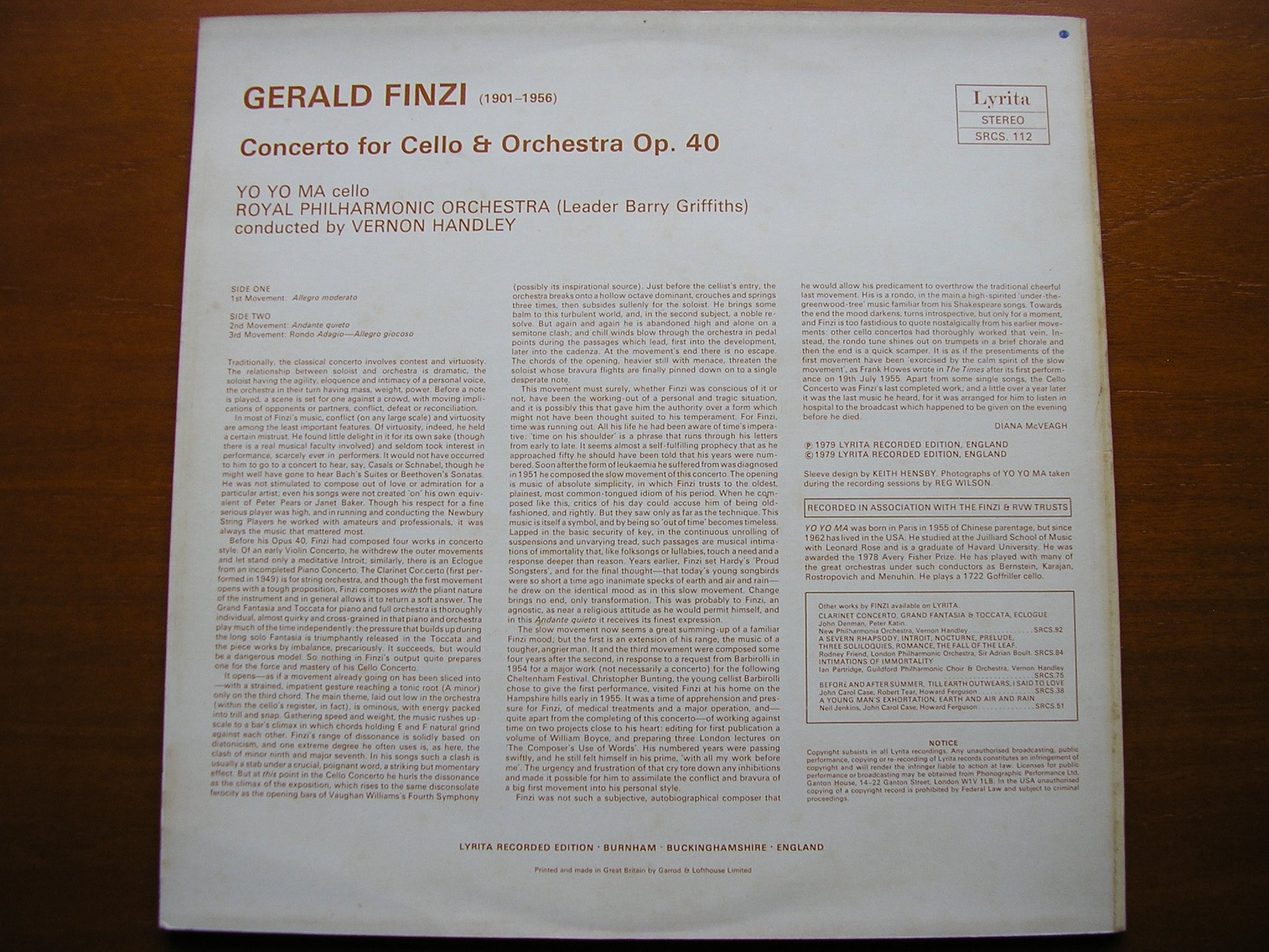 FINZI: CELLO CONCERTO YO YO MA / ROYAL PHILHARMONIC / HANDLEY SRCS 112