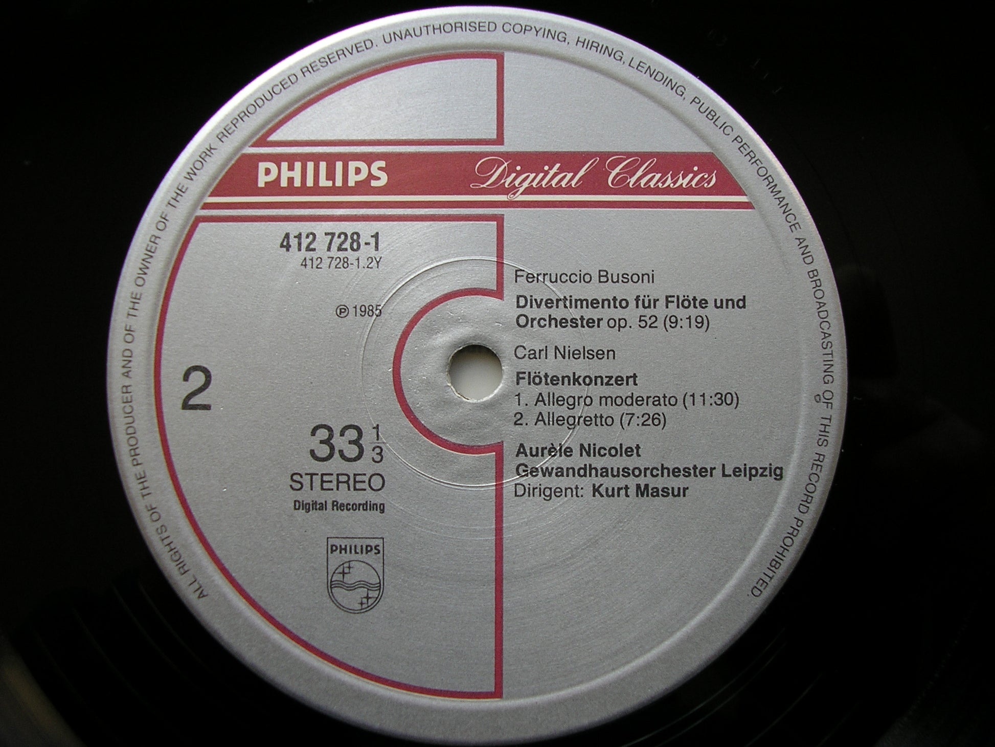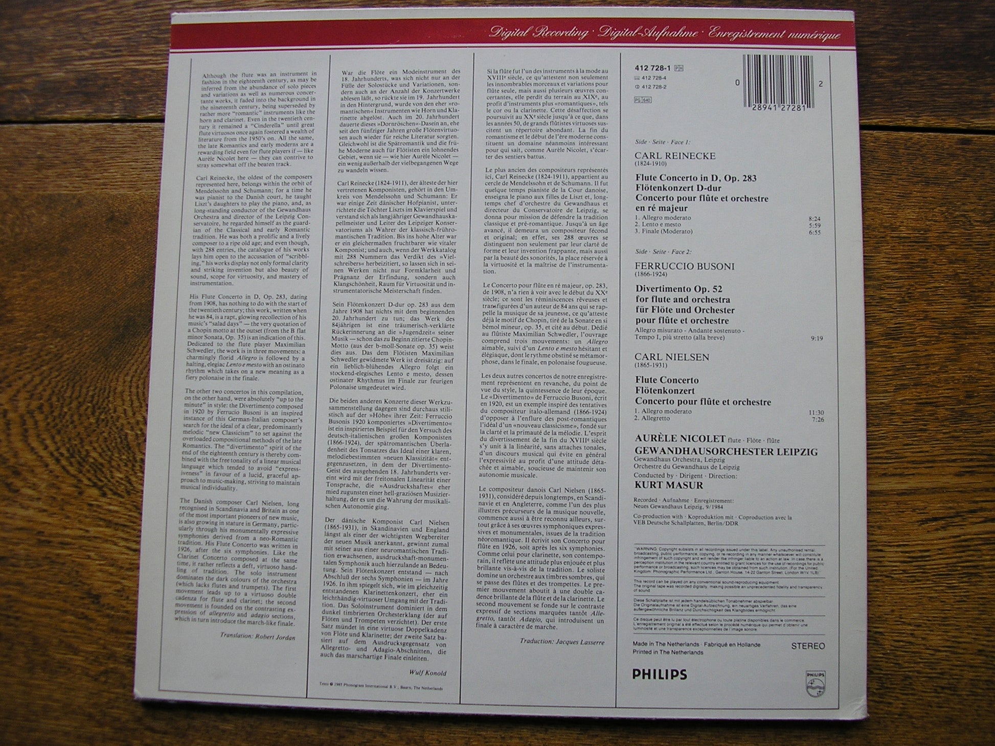 412 728  FLUTE CONCERTOS: REINECKE Concerto in D Op. 283 / NIELSEN Concerto BUSONI Divertimento Op. 52    AURELE NICOLET / LEIPZIG GEWANDHAUS ORCHESTRA / KURT MASUR