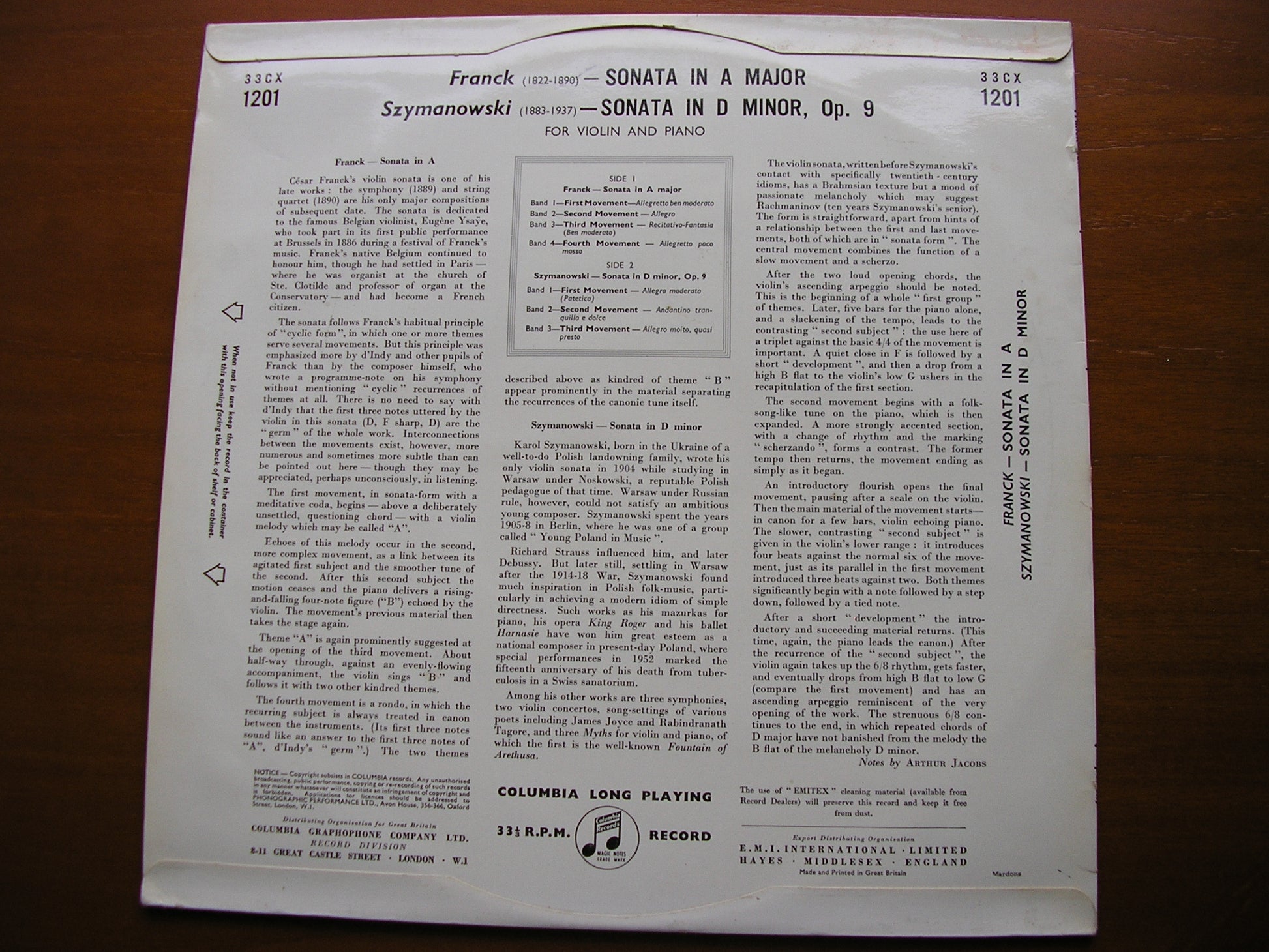 33CX 1201  FRANCK: SONATA in A / SZYMANOWSKI SONATA in D     DAVID OISTRAKH / VLADIMIR YAMPOLSKY