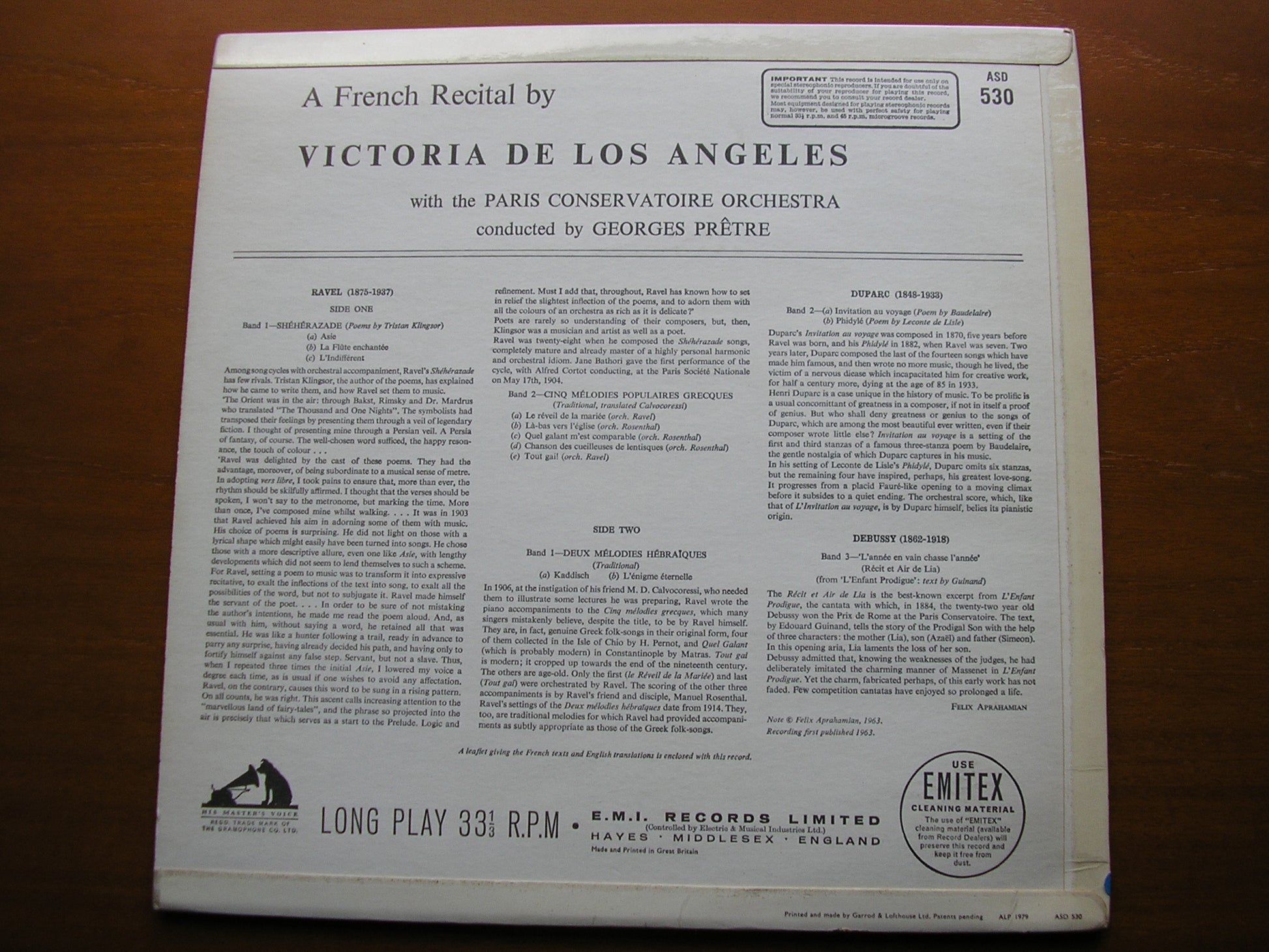 ASD 530  FRENCH SONGS: DEBUSSY / RAVEL / DUPARC     VICTORIA DE LOS ANGELES / PARIS CONSERVATOIRE / GEORGES PRETRE
