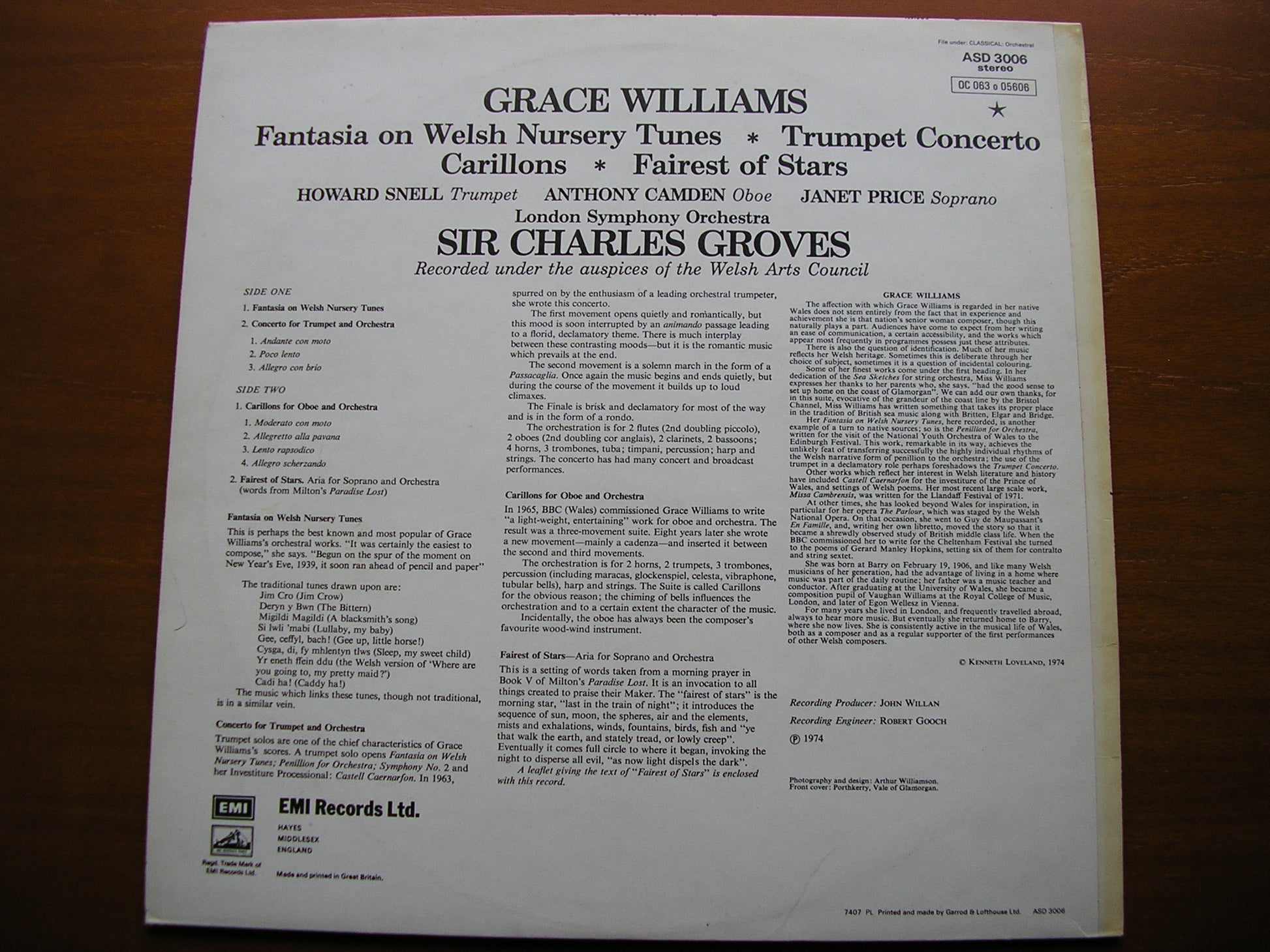 ASD 3006  GRACE WILLIAMS: FANTASIA ON WELSH NURSERY TUNES / TRUMPET CONCERTO / CARILLONS / FAIREST OF STARS    HOWARD SNELL / JANET PRICE / ANTHONY CAMDEN / SIR CHARLES GROVES / LONDON SYMPHONY ORCHESTRA
