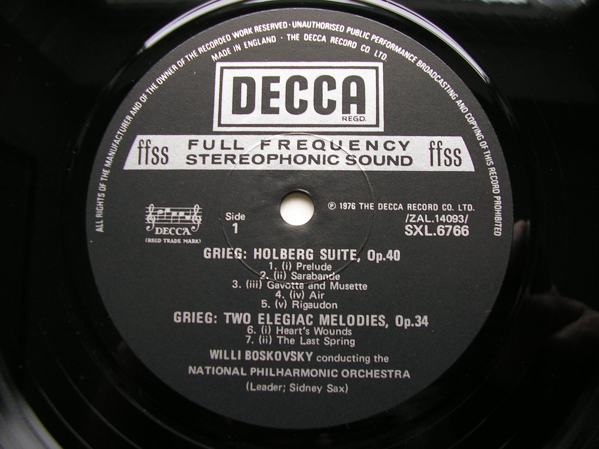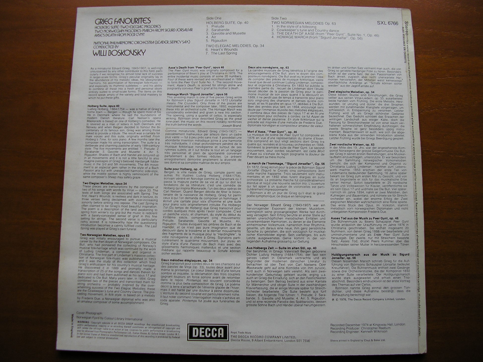 SXL 6766  GRIEG: HOLBERG SUITE / TWO ELEGIAC MELODIES / TWO NORWEGIAN MELODIES / MARCH / AASE'S DEATH from PEER GYNT     WILLI BOSKOVSKY / NATIONAL PHILHARMONIC ORCHESTRA