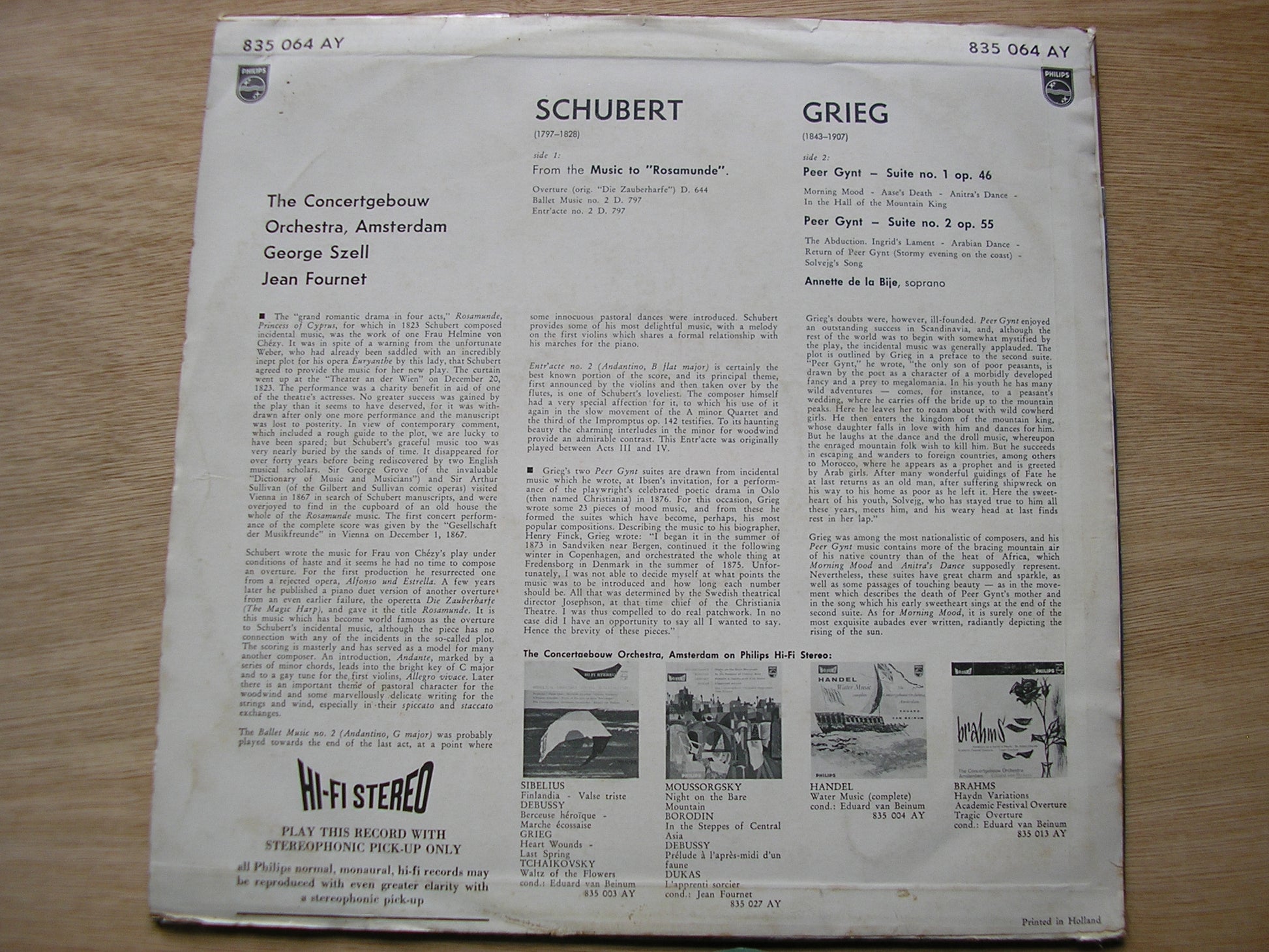 835 064 AY  GRIEG: PEER GYNT / SCHUBERT: ROSAMUNDE      GEORGE SZELL / JEAN FOURNET / CONCERTGEBOUW ORCHESTRA AMSTERDAM
