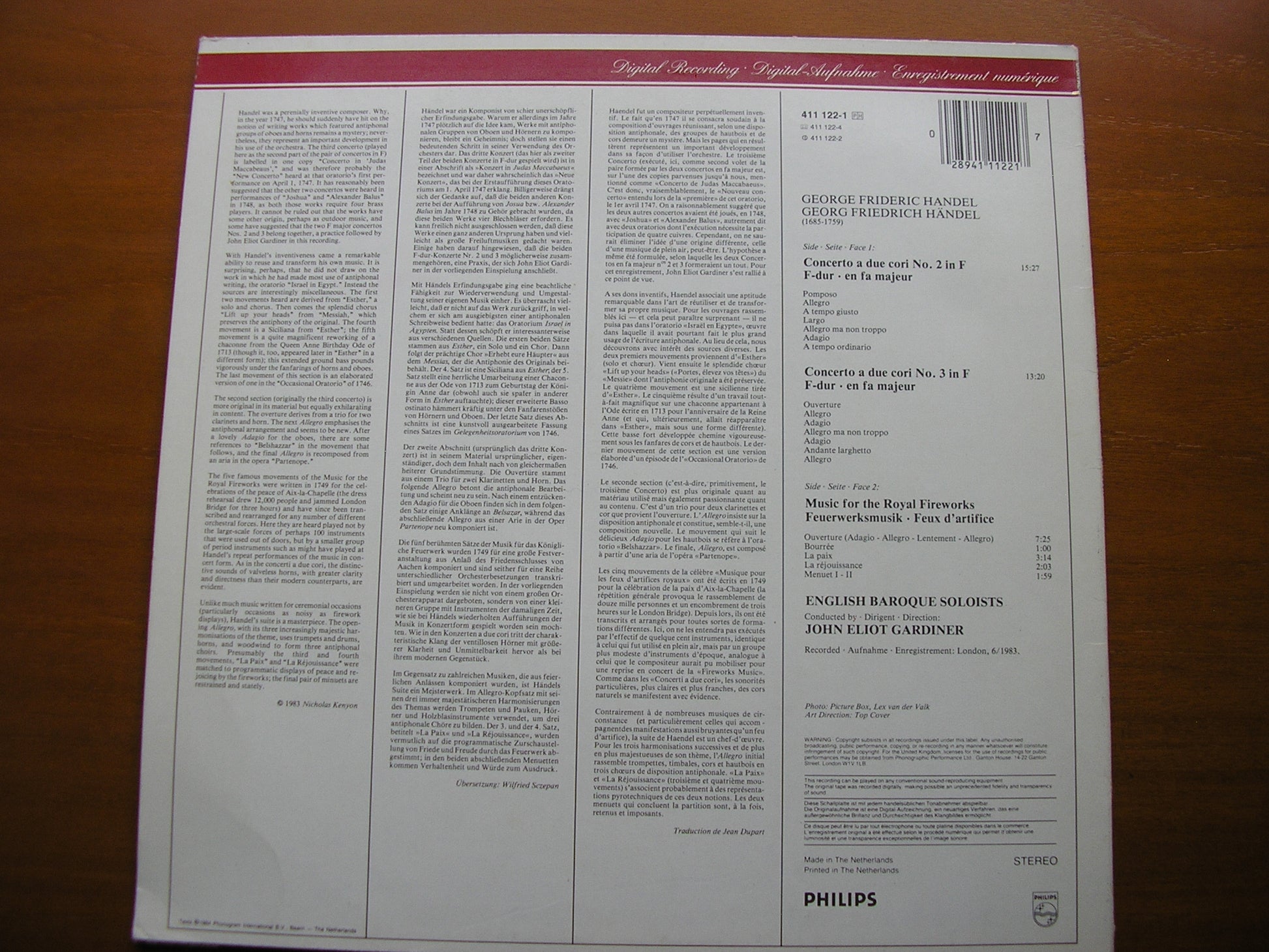 411 122  HANDEL: MUSIC FOR THE ROYAL FIREWORKS / TWO CONCERTI 'a due cori'  JOHN ELIOT GARDINER / ENGLISH BAROQUE SOLOISTS