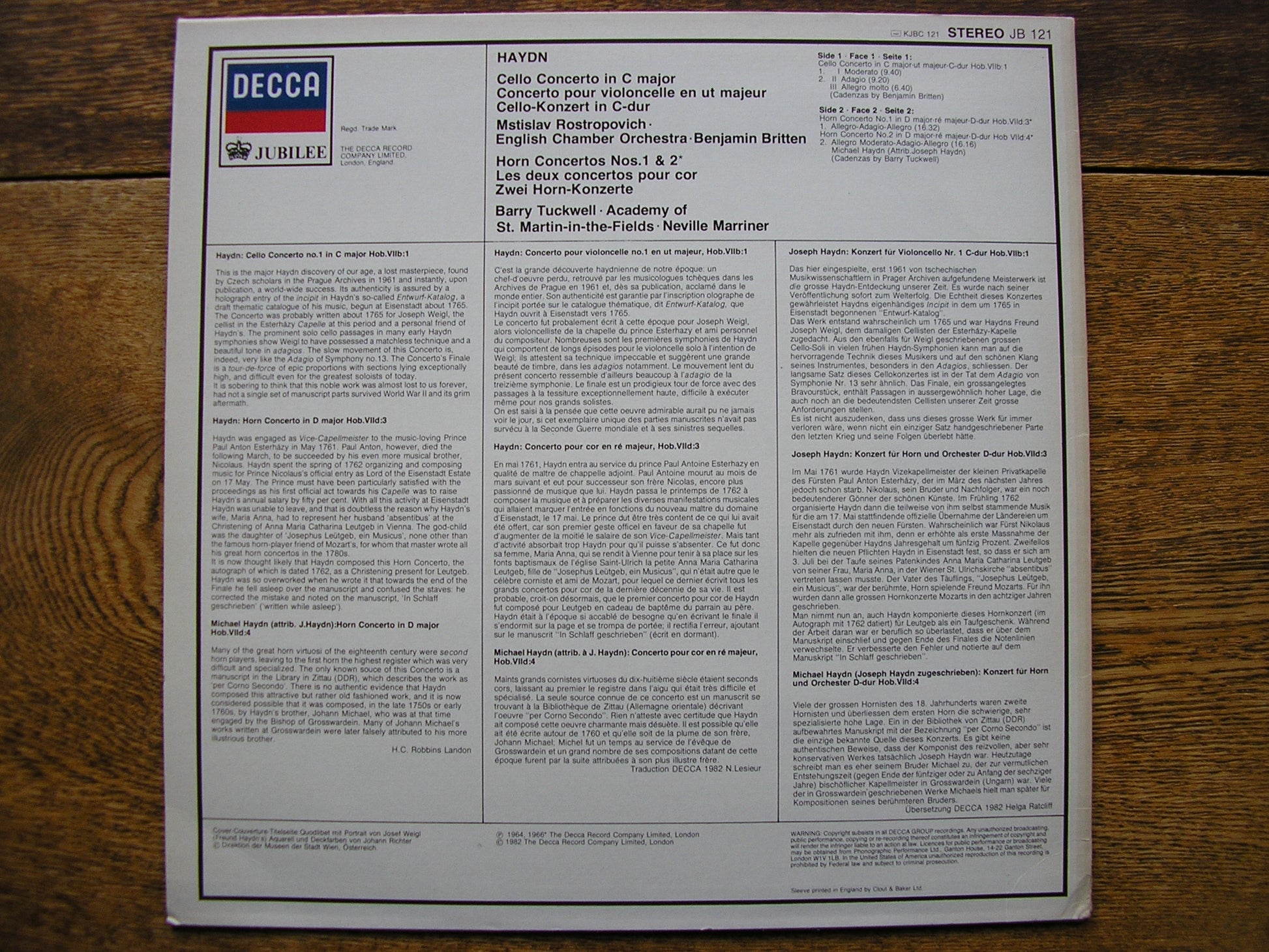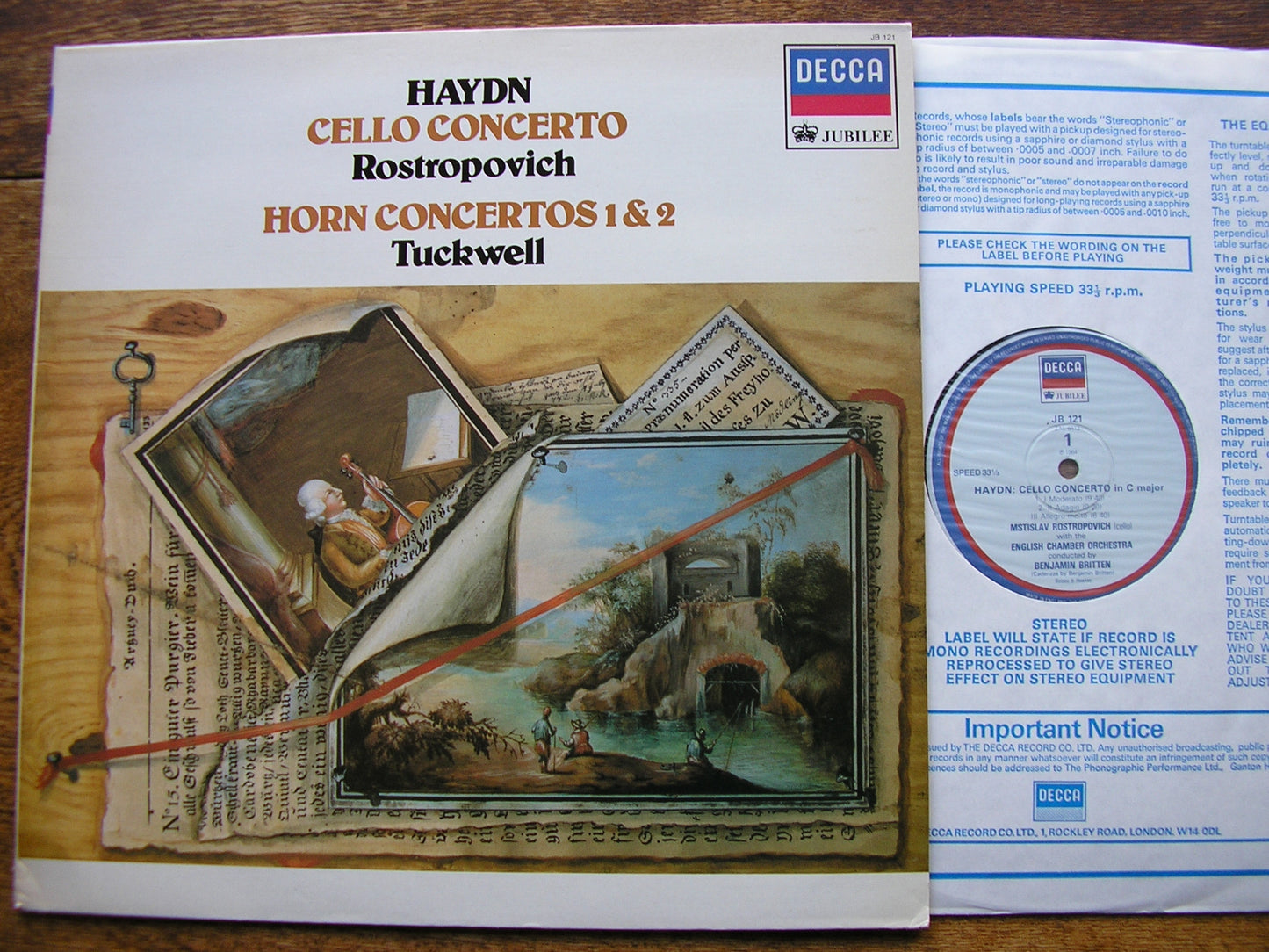 JB 121  HAYDN: CELLO CONCERTO / HORN CONCERTOS Nos. 1 & 2  MSTISLAV ROSTROPOVICH / ENGLISH CHAMBER ORCHESTRA / BENJAMIN BRITTEN     BARRY TUCKWELL / ASMIF / NEVILLE MARRINER
