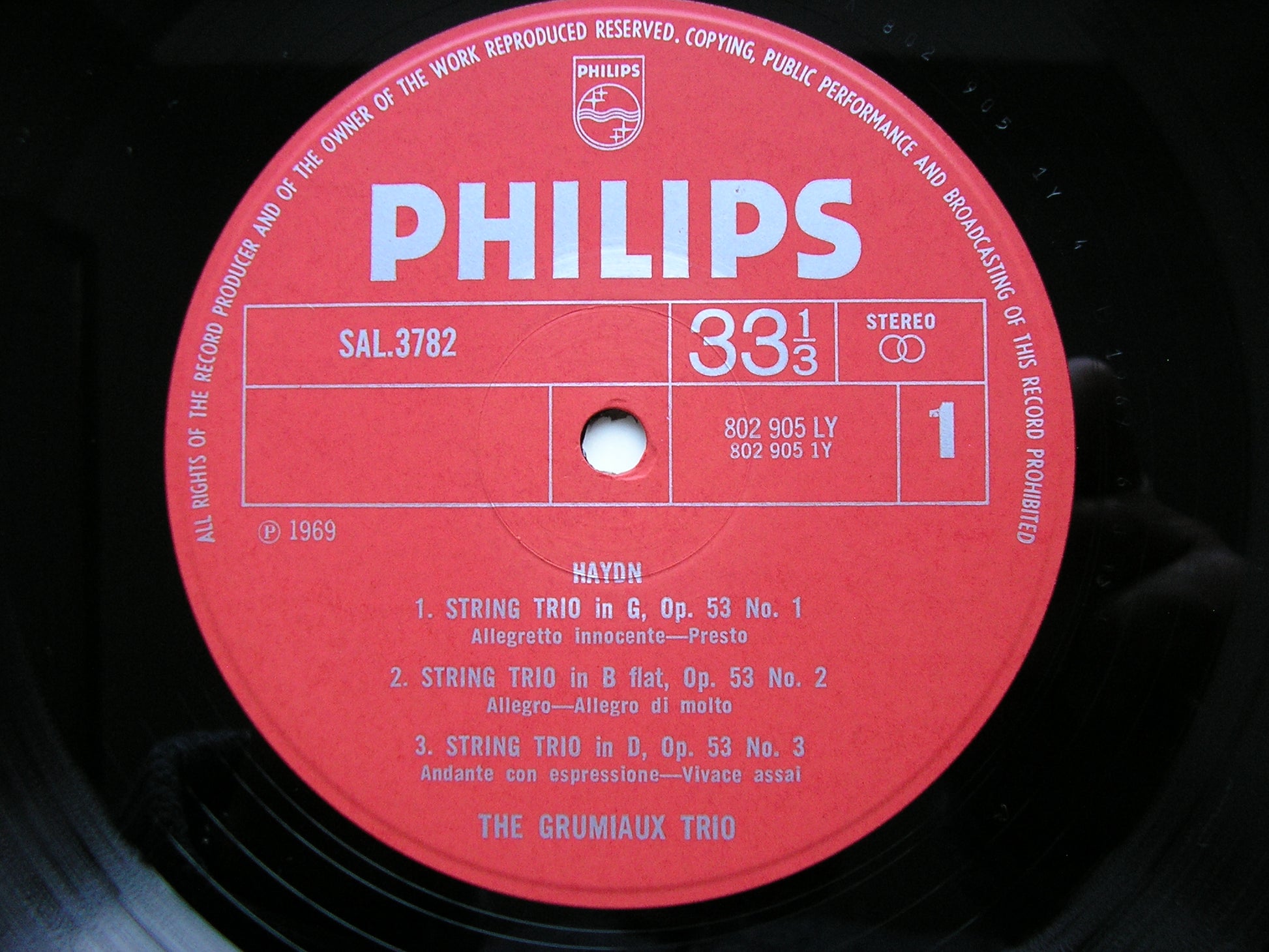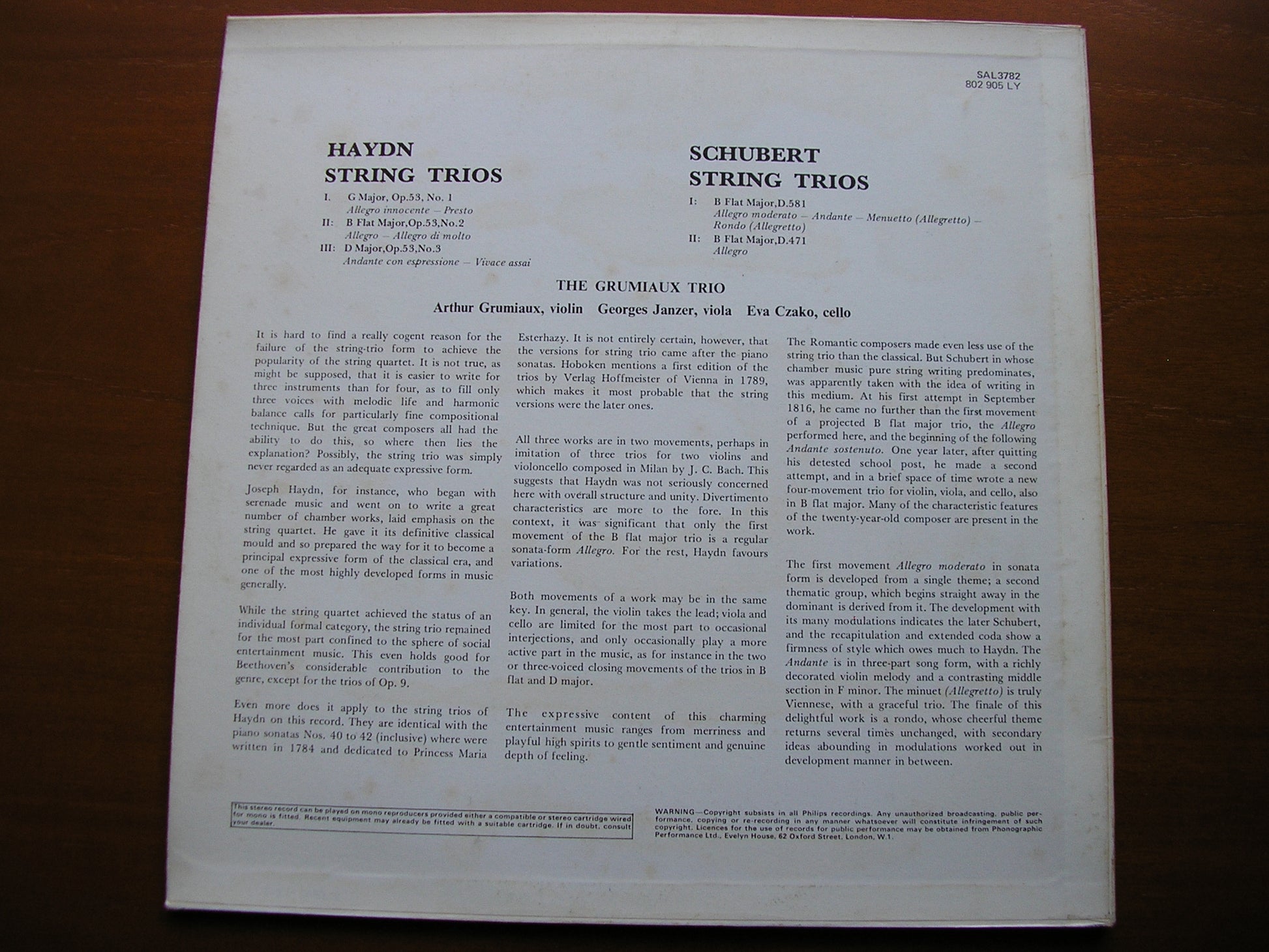 SAL 3782   HAYDN: 3 STRING TRIOS Op. 53 / SCHUBERT: 2 STRING TRIOS D471 & D581 / THE GRUMIAUX TRIO