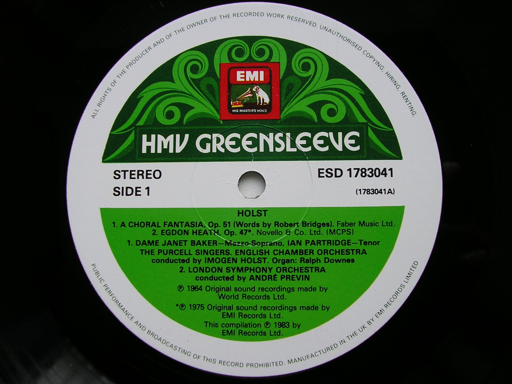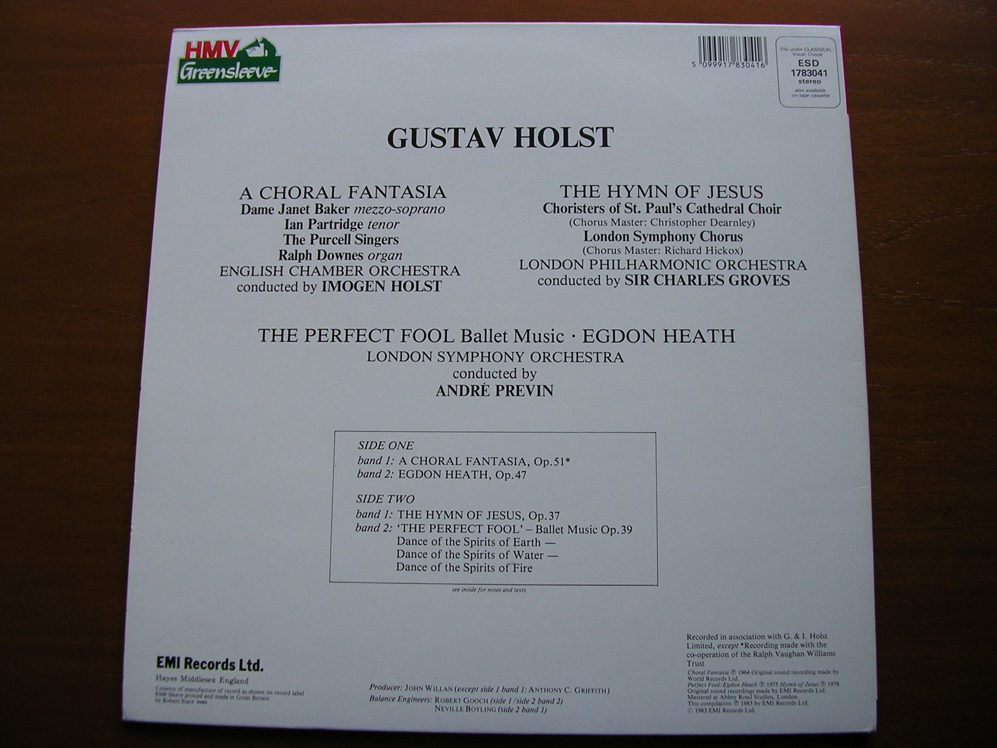 ESD 1783041  HOLST: A CHORAL FANTASIA / THE HYMN OF JESUS / EGDON HEATH / THE PERFECT FOOL    ENGLISH CHAMBER ORCHESTRA / IMOGEN HOLST / LONDON SYMPHONY ORCHESTRA / ANDRE PREVIN / LONDON PHILHARMONIC ORCHESTRA / SIR CHARLES GROVES