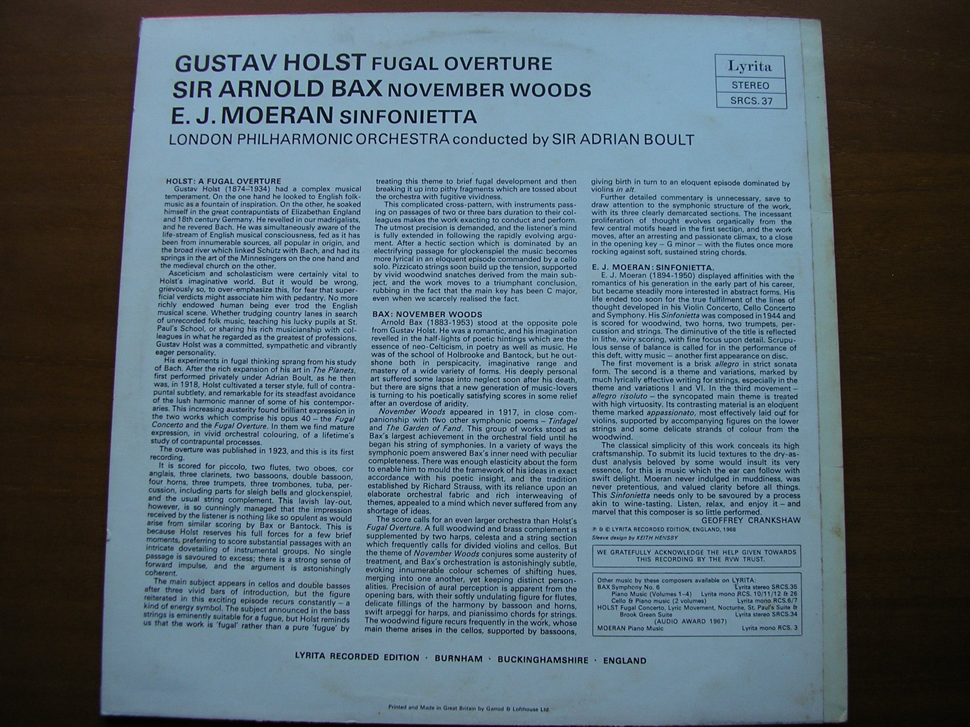 SRCS 37  HOLST: FUGAL OVERTURE / MOERAN: SINFONIETTA / BAX: NOVEMBER WOODS  SIR ADRIAN BOULT / LONDON PHILHARMONIC ORCHESTRA