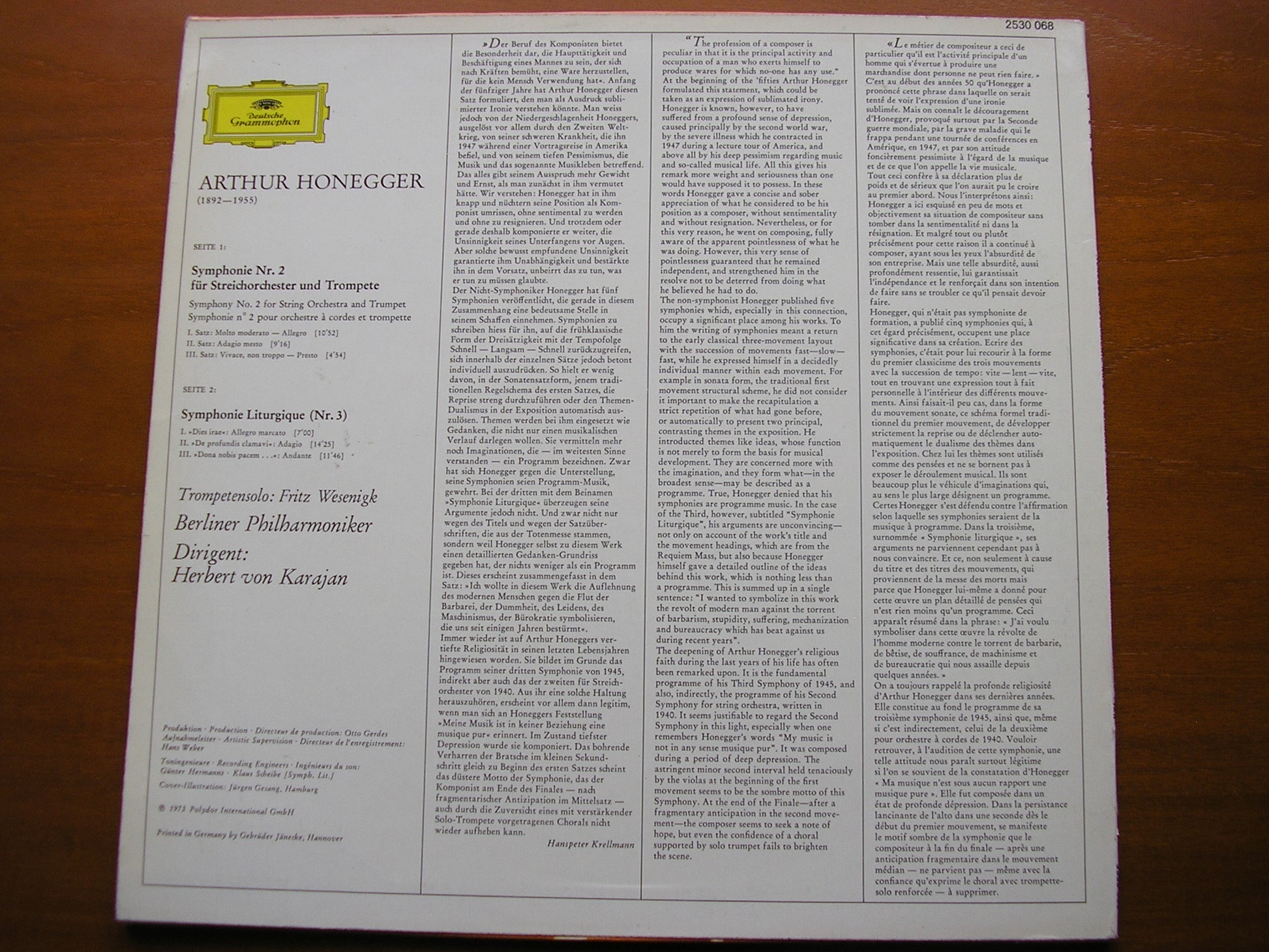 2530 068  HONEGGER: SYMPHONIES Nos. 2 & 3     HERBERT VON KARAJAN / BERLIN PHILHARMONIC ORCHESTRA