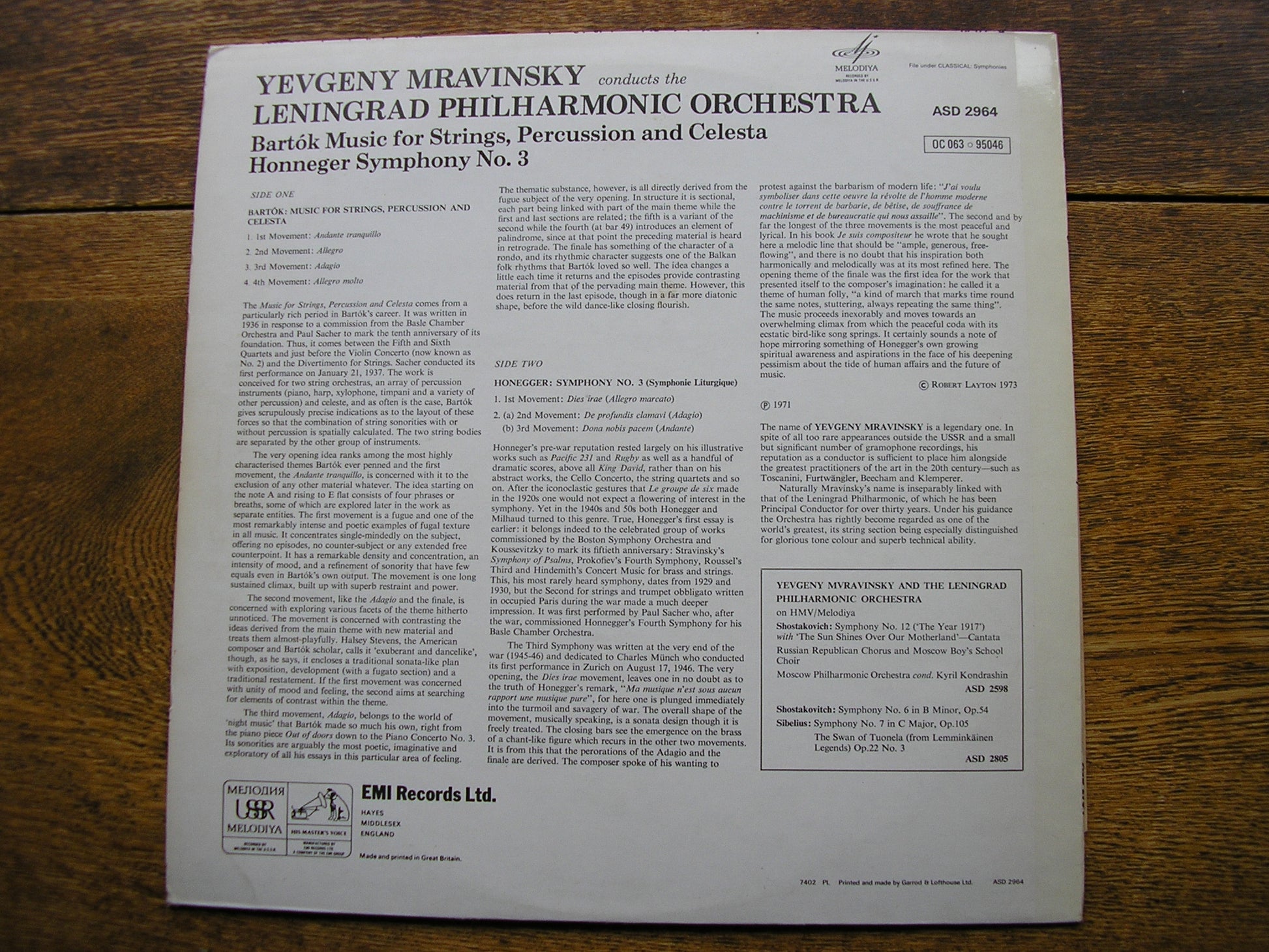 ASD 2964  HONEGGER: SYMPHONY No. 3 / BARTOK: MUSIC FOR STRINGS, PERCUSSION & CELESTA   YEVGENY MRAVINSKY / LENINGRAD PHILHARMONIC ORCHESTRA