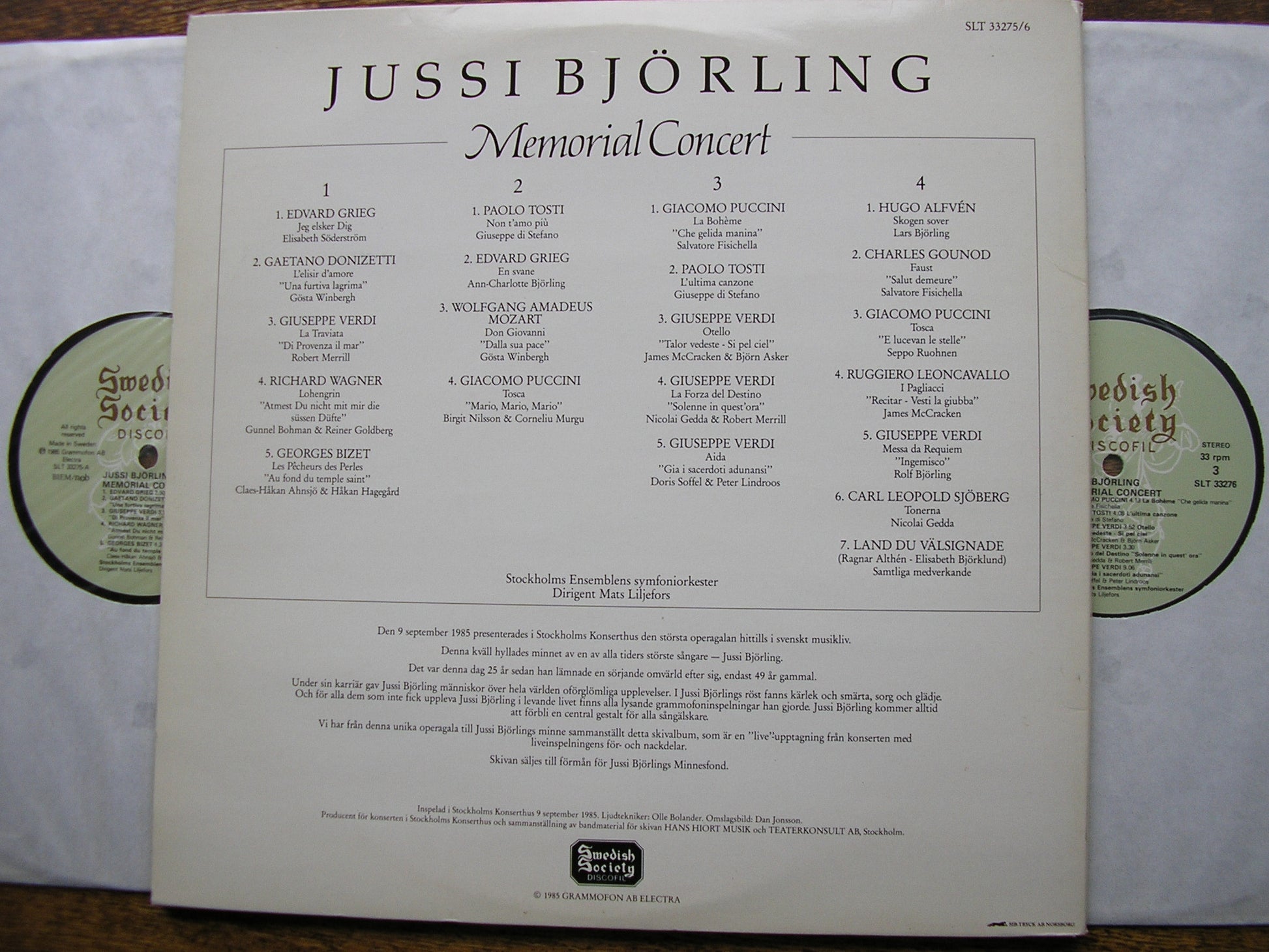 SLT 33275 / 6  JUSSI BJORLING MEMORIAL CONCERT from STOCKHOLM on 9th SEPTEMBER 1985.  SALVATORE FISICHELLA / ROBERT MERRILL / NICOLAI GEDDA / BIRGIT NILSSON / LARS BJORLING / ANN-CHARLOTTE  BJORLING / ROLF BJORLING / ELISABETH SODERSTROM / GIUSEPPE DI STEFANO /JAMES McCRACKEN / HAKAN HAGEGARD / DORIS SOFFEL / PETER LINDROOS / GOSTA WINBERGH / CLAES HAKAN AHNSJO / STOCKHOLM SYMPHONY ORCHESTRA / MATS LILJEFORS