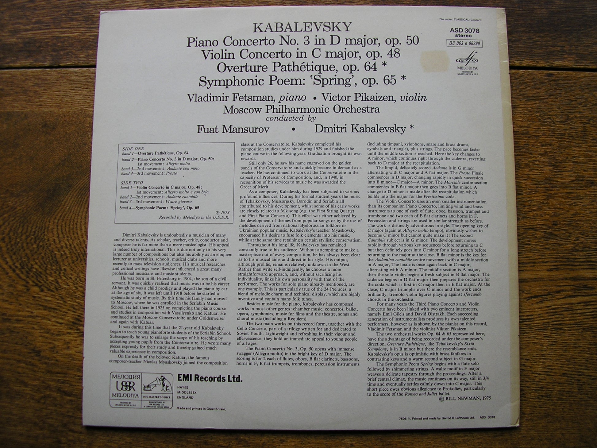 ASD 3078  KABALEVSKY: PIANO CONCERTO No. 3 / VIOLIN CONCERTO / OVERTURE / SYMPHONIC POEM 'SPRING'    VLADIMIR FETSMAN / VICTOR PIKAIZEN / MOSCOW PHILHARMONIC ORCHESTRA   FUAT MANSUROV / DMITRI KABALEVSKY