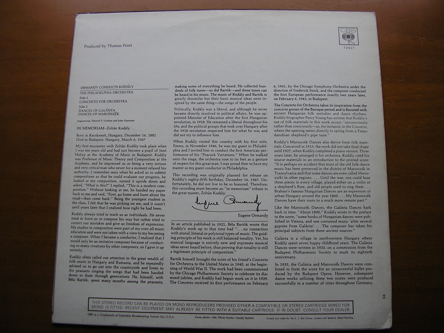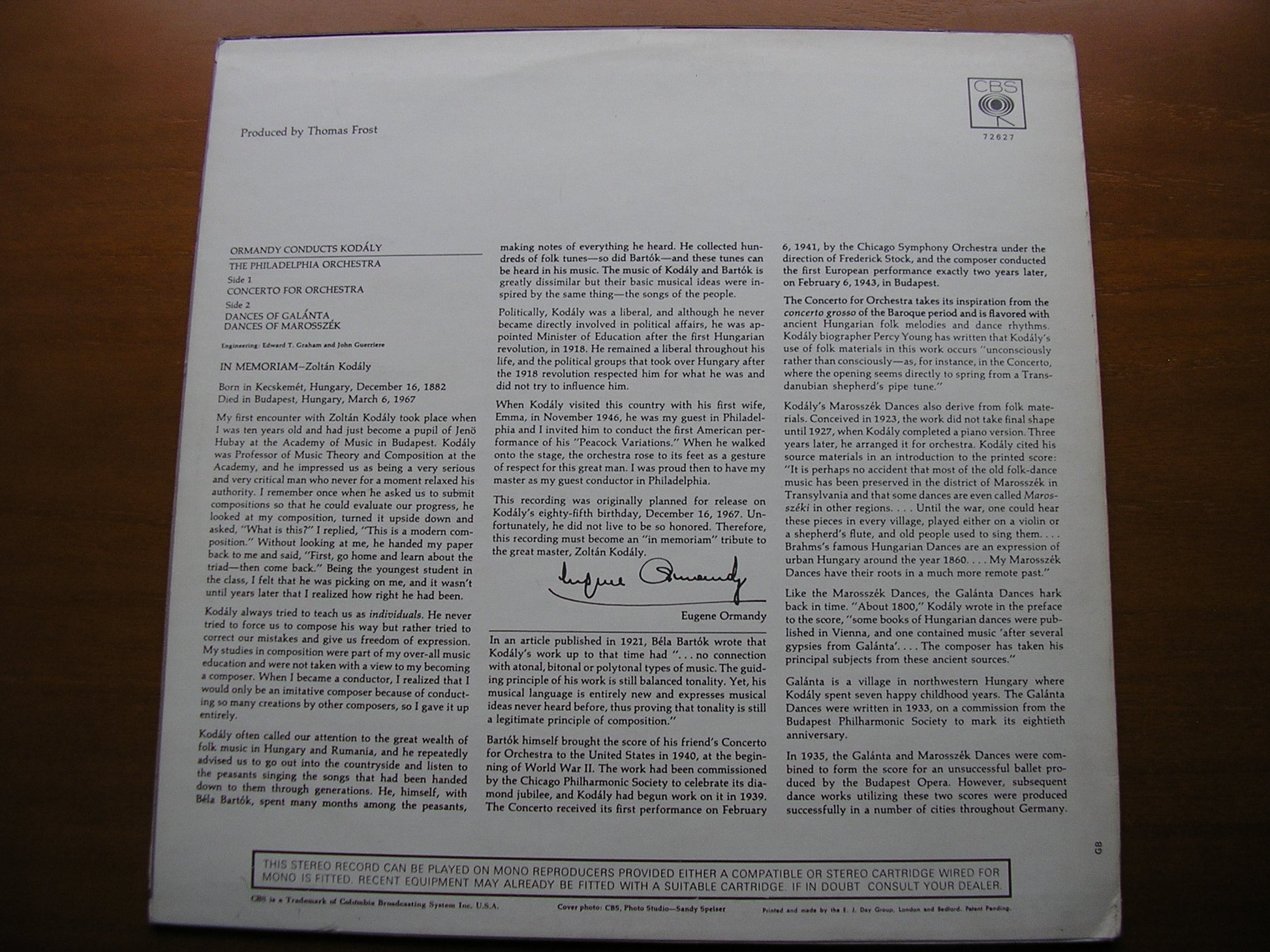 72627  KODALY: CONCERTO FOR ORCHESTRA / DANCES OF GALANTA / DANCES OF MAROSSZEK       EUGENE ORMANDY / PHILADELPHIA ORCHESTRA