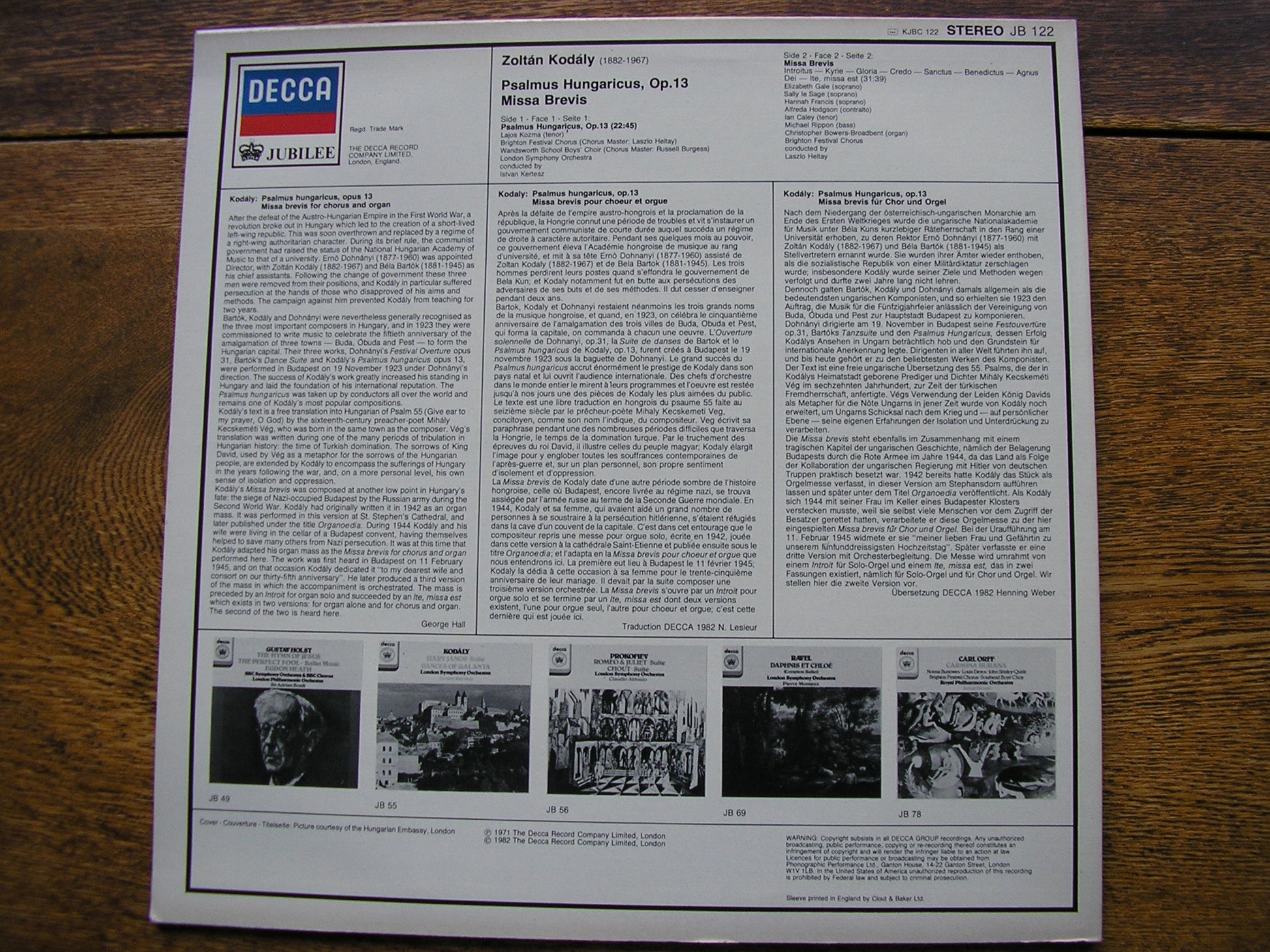 JB 122  KODALY: PSALMUS HUNGARICUS / MISSA BREVIS   LAJOS KOZMA / LONDON SYMPHONY ORCHESTRA / LASZLO HELTAY / ISTVAN KERTESZ