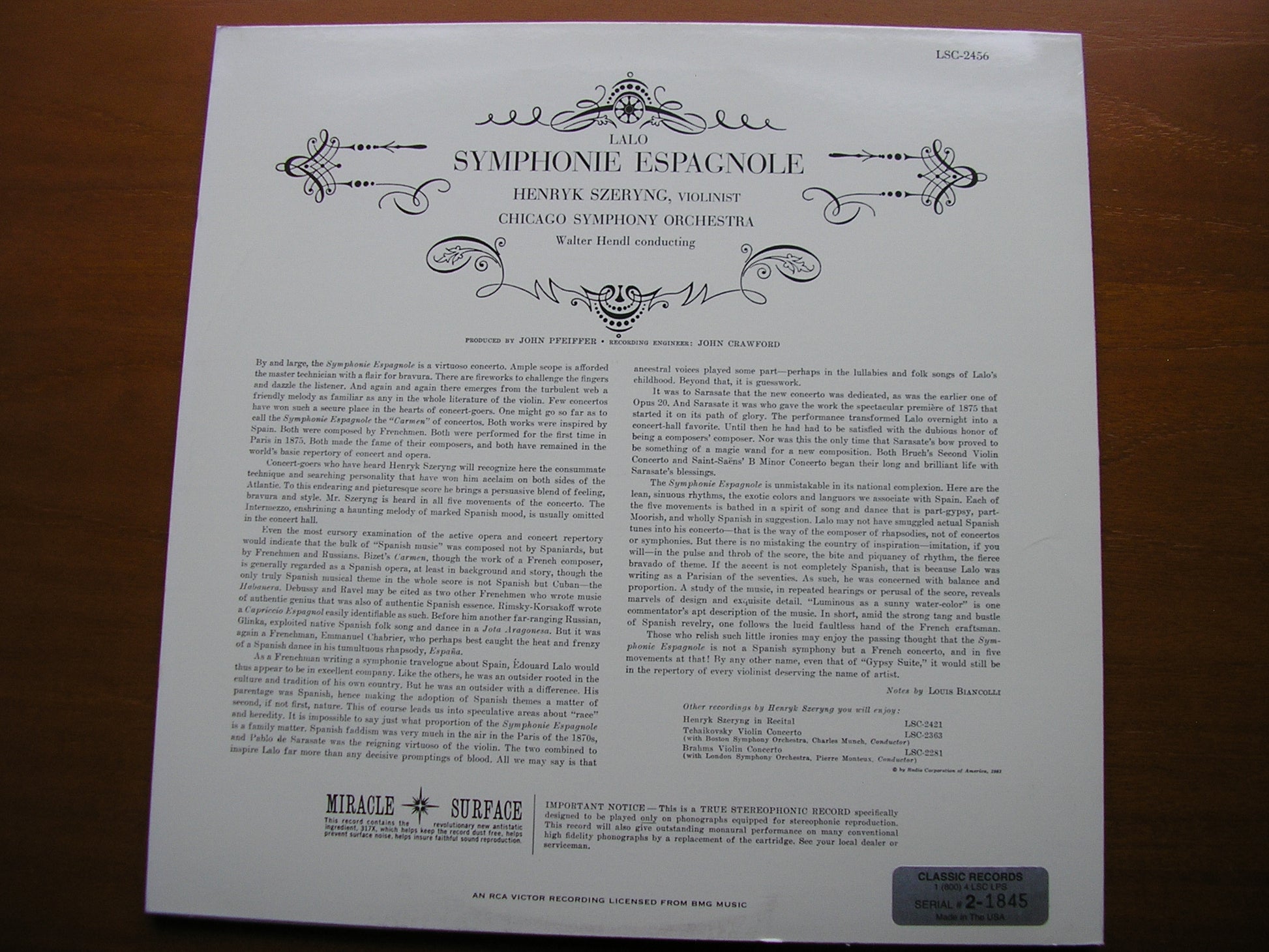 LSC 2456  LALO: SYMPHONIE ESPAGNOLE       HENRYK SZERYNG / CHICAGO SYMPHONY ORCHESTRA / WALTER HENDL
