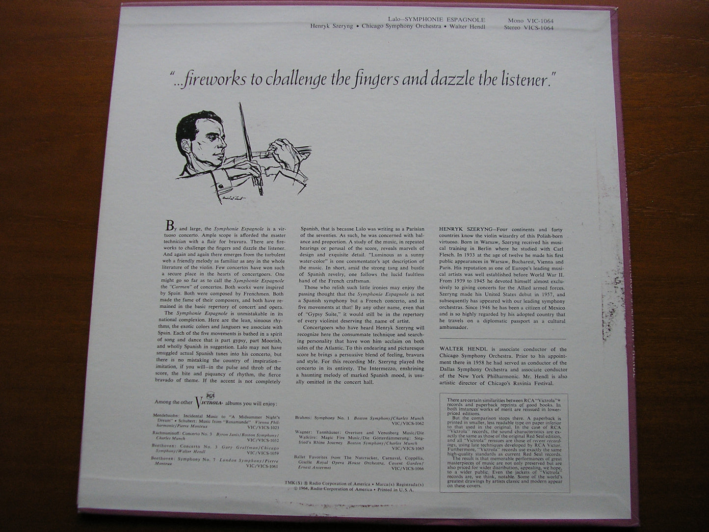 VICS 1064  LALO: SYMPHONIE ESPAGNOLE     HENRYK SZERYNG / CHICAGO SYMPHONY ORCHESTRA / WALTER HENDL