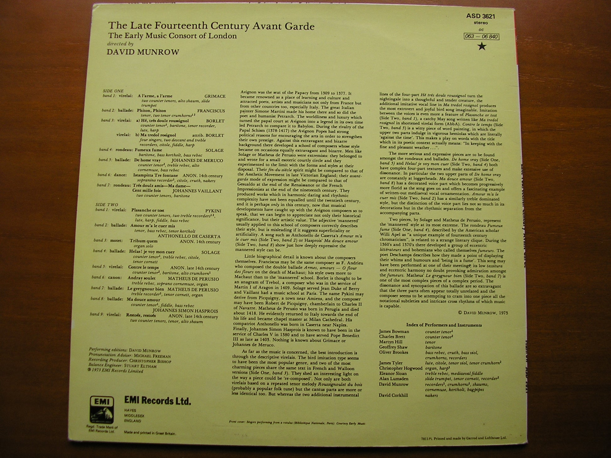 LATE 14th CENTURY AVANT GARDE: SONGS & INSTRUMENTAL PIECES THE EARLY MUSIC CONSORT OF LONDON / MUNROW ASD 3621