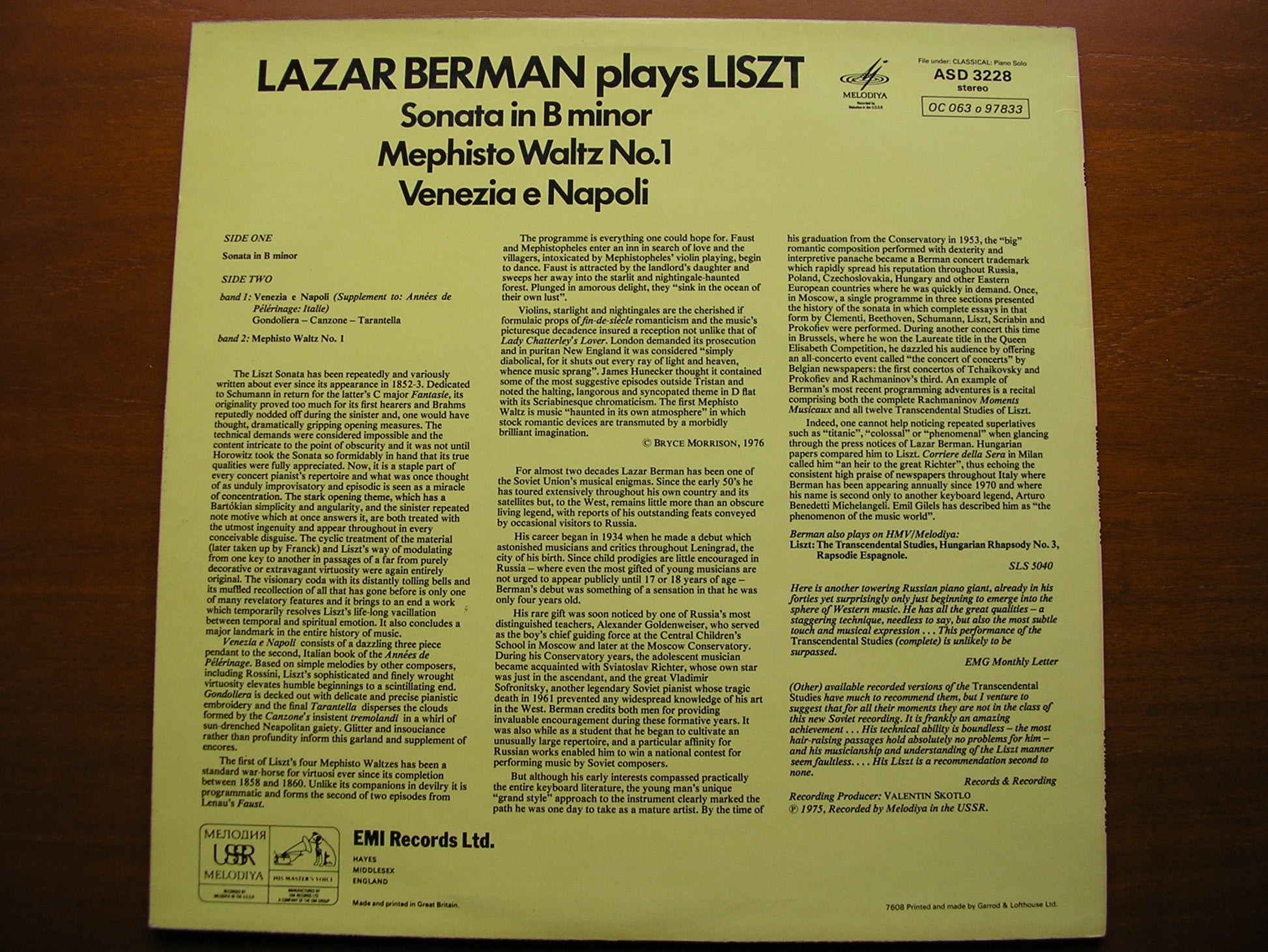 LAZAR BERMAN PLAYS LISZT: SONATA in B Minor / VENEZIA e NAPOLI / MEPHISTO WALTZ No.1 ASD 3228