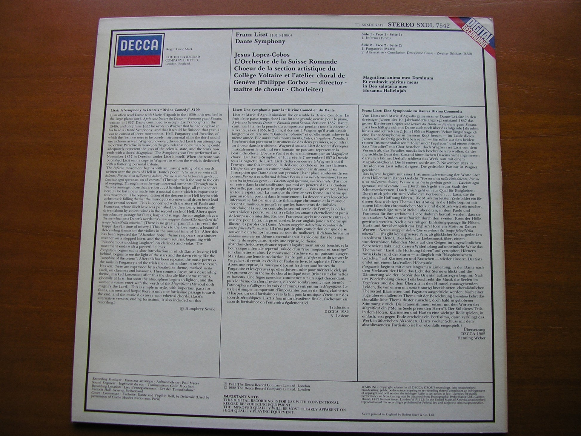 LISZT: DANTE SYMPHONY LOPEZ - COBOS / SUISSE ROMANDE ORCHESTRA SXDL 7542