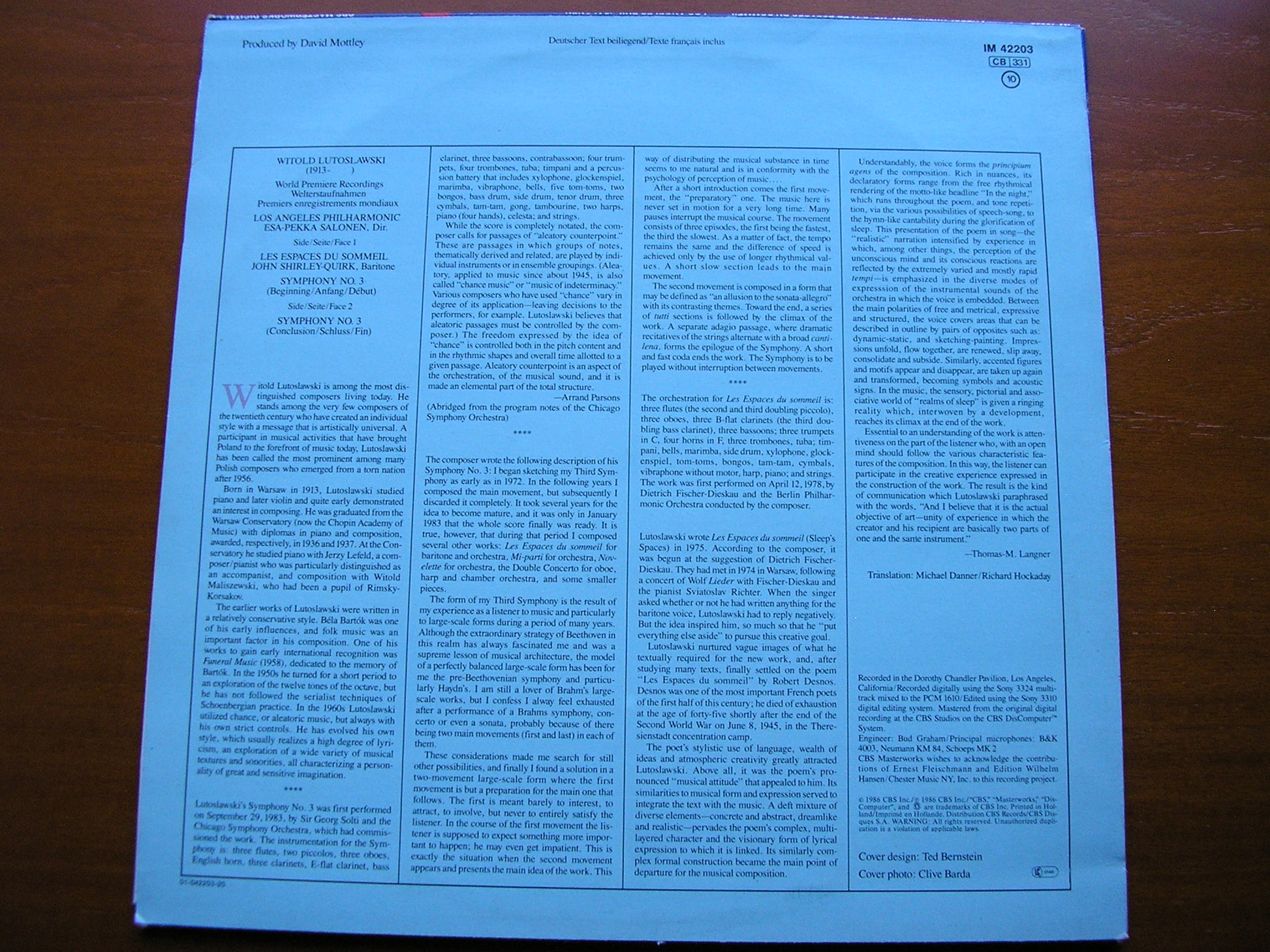 LUTOSLAWSKI: SYMPHONY No. 3 / LES ESPACES DU SOMMEIL SHIRLEY - QUIRK / LAPO / SALONEN IM 42203