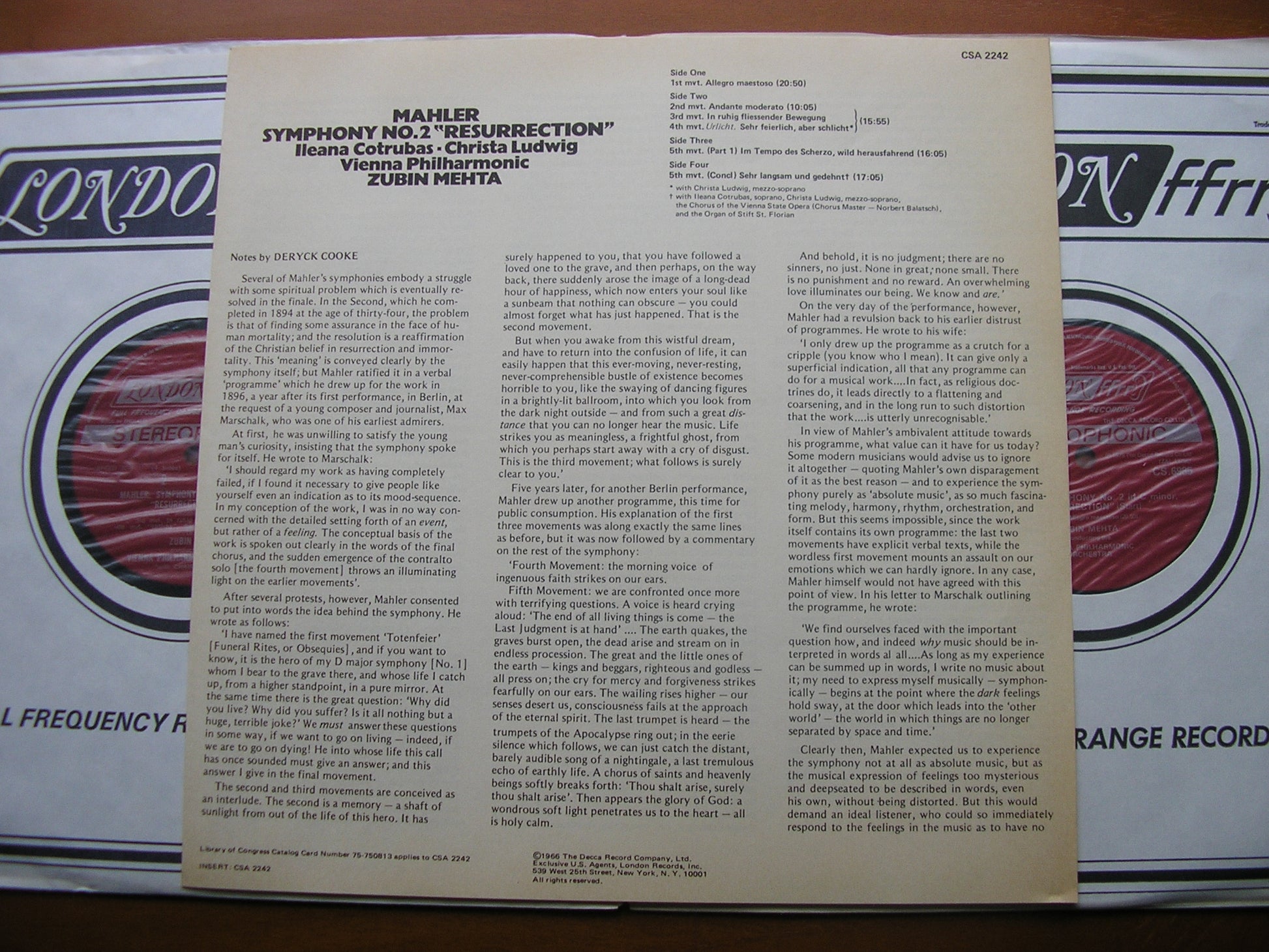 CSA 2242  MAHLER: SYMPHONY No. 2   ILEANA COTRUBAS / CHRISTA LUDWIG / VIENNA PHILHARMONIC ORCHESTRA / ZUBIN MEHTA