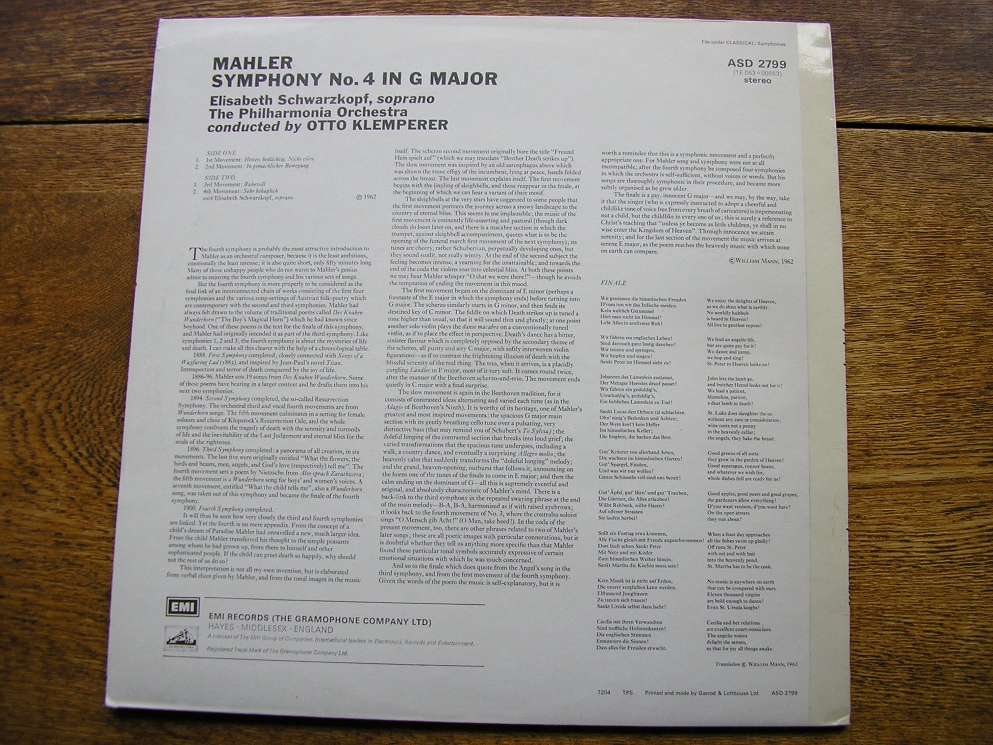MAHLER: SYMPHONY No. 4 SCHWARZKOPF / PHILHARMONIA / KLEMPERER ASD 2799