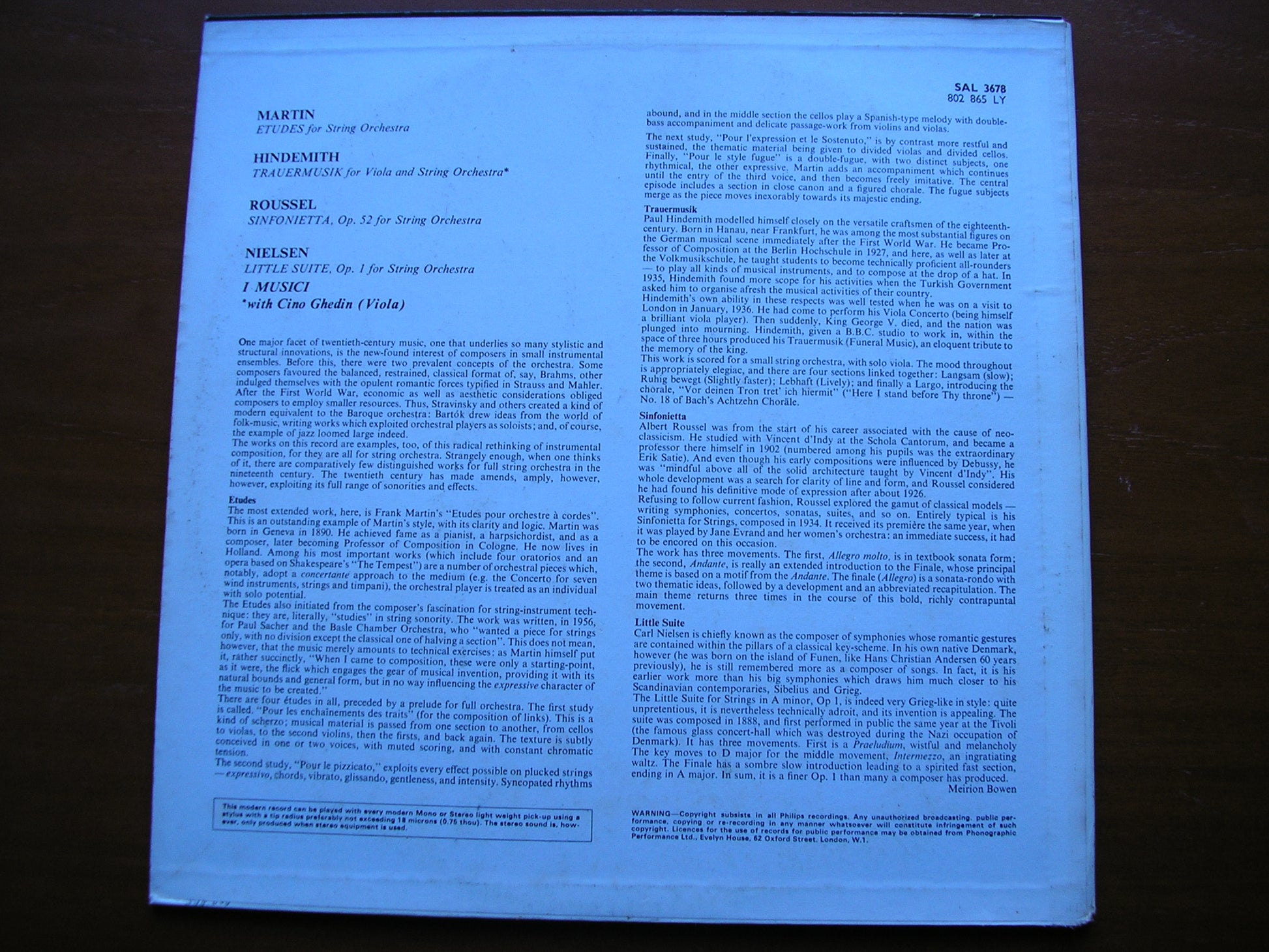 SAL 3678  MARTIN: ETUDES / HINDEMITH: TRAUERMUSIK / ROUSSEL: SINFONIETTA / NIELSEN: LITTLE SUITE     I MUSICI / CINO GHEDIN