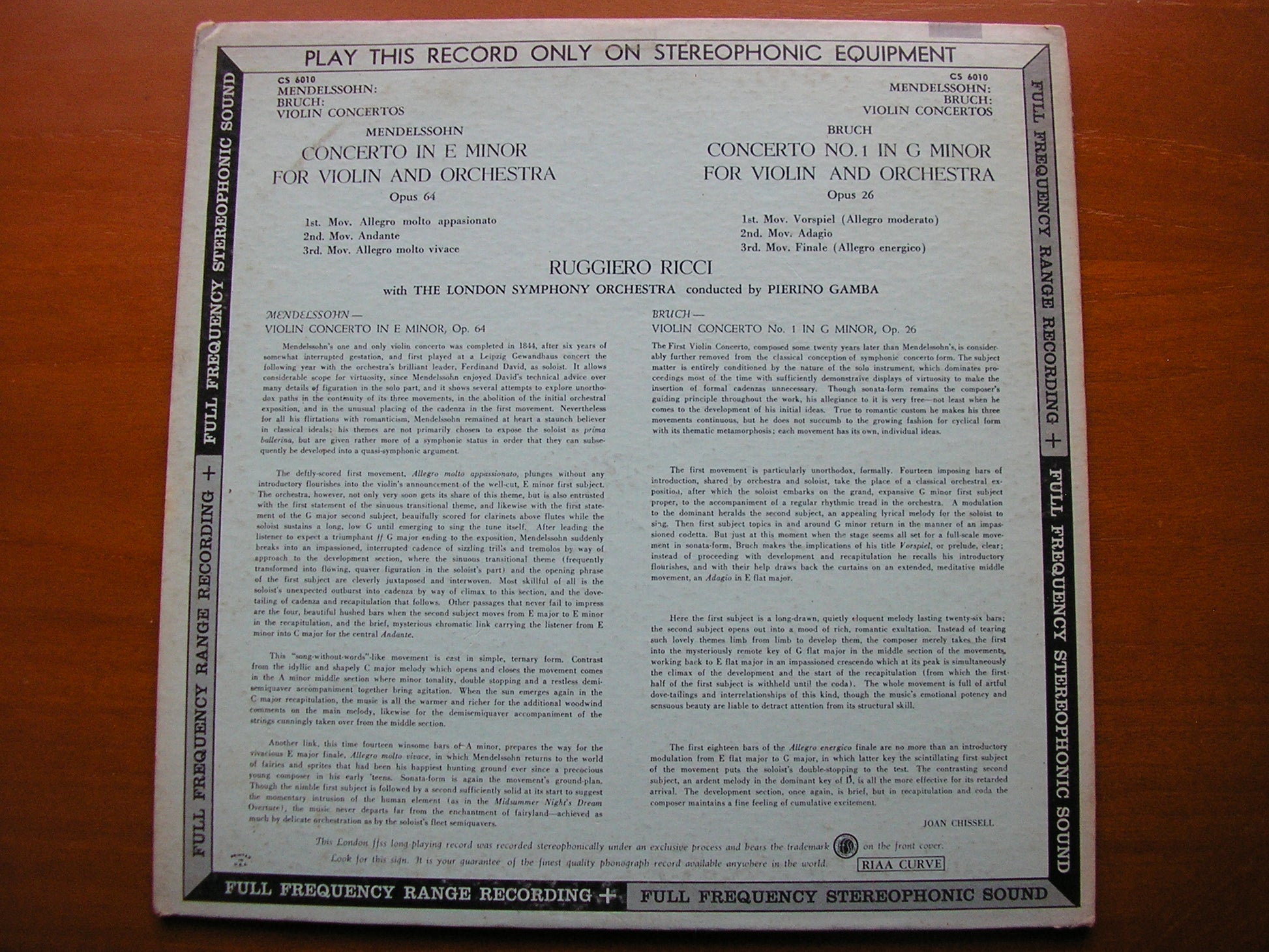 CS 6010  MENDELSSOHN: VIOLIN CONCERTO in E / BRUCH: VIOLIN CONCERTO No. 1 RUGGIERO RICCI / LONDON SYMPHONY ORCHESTRA / PIERINO GAMBA