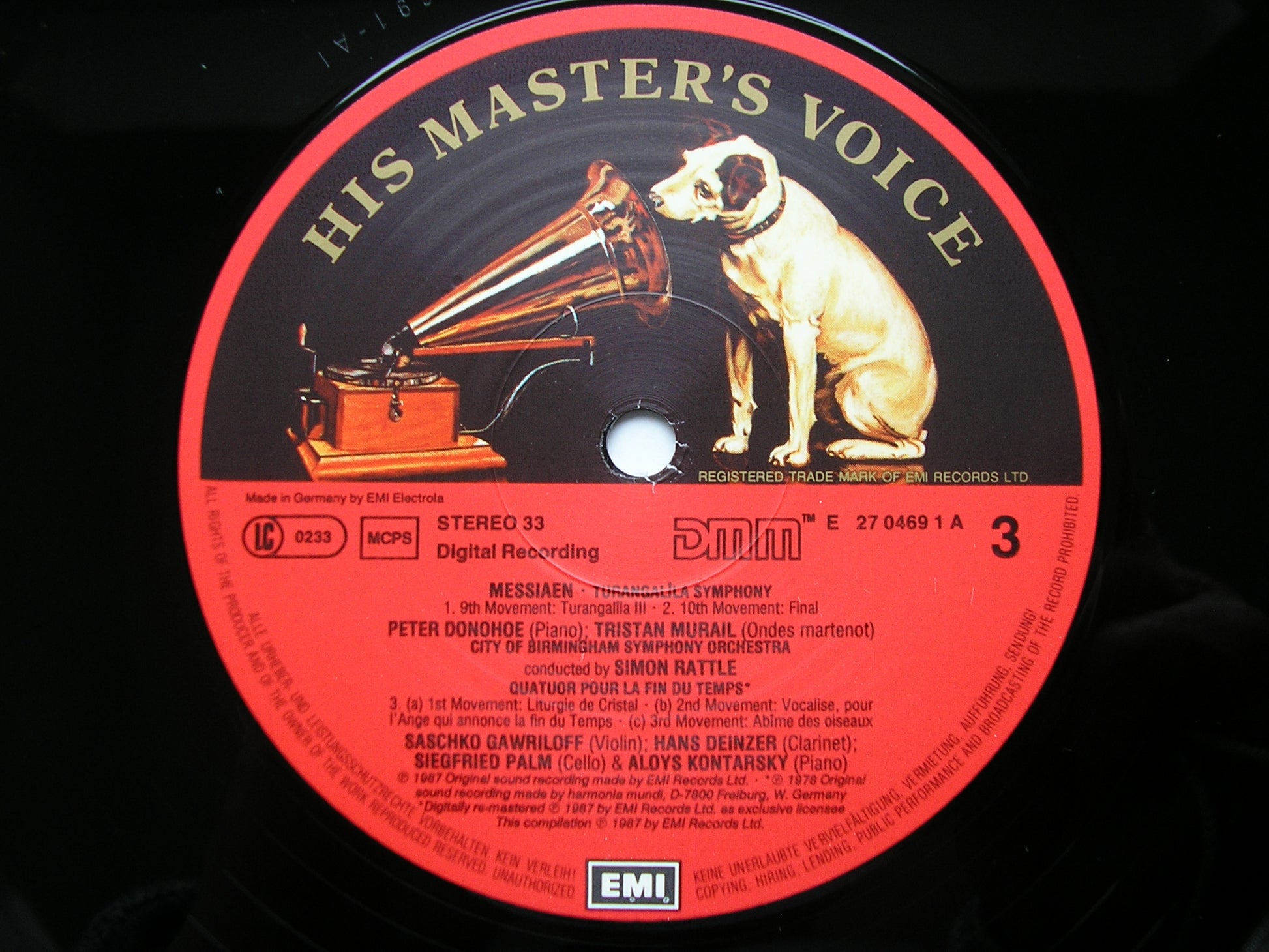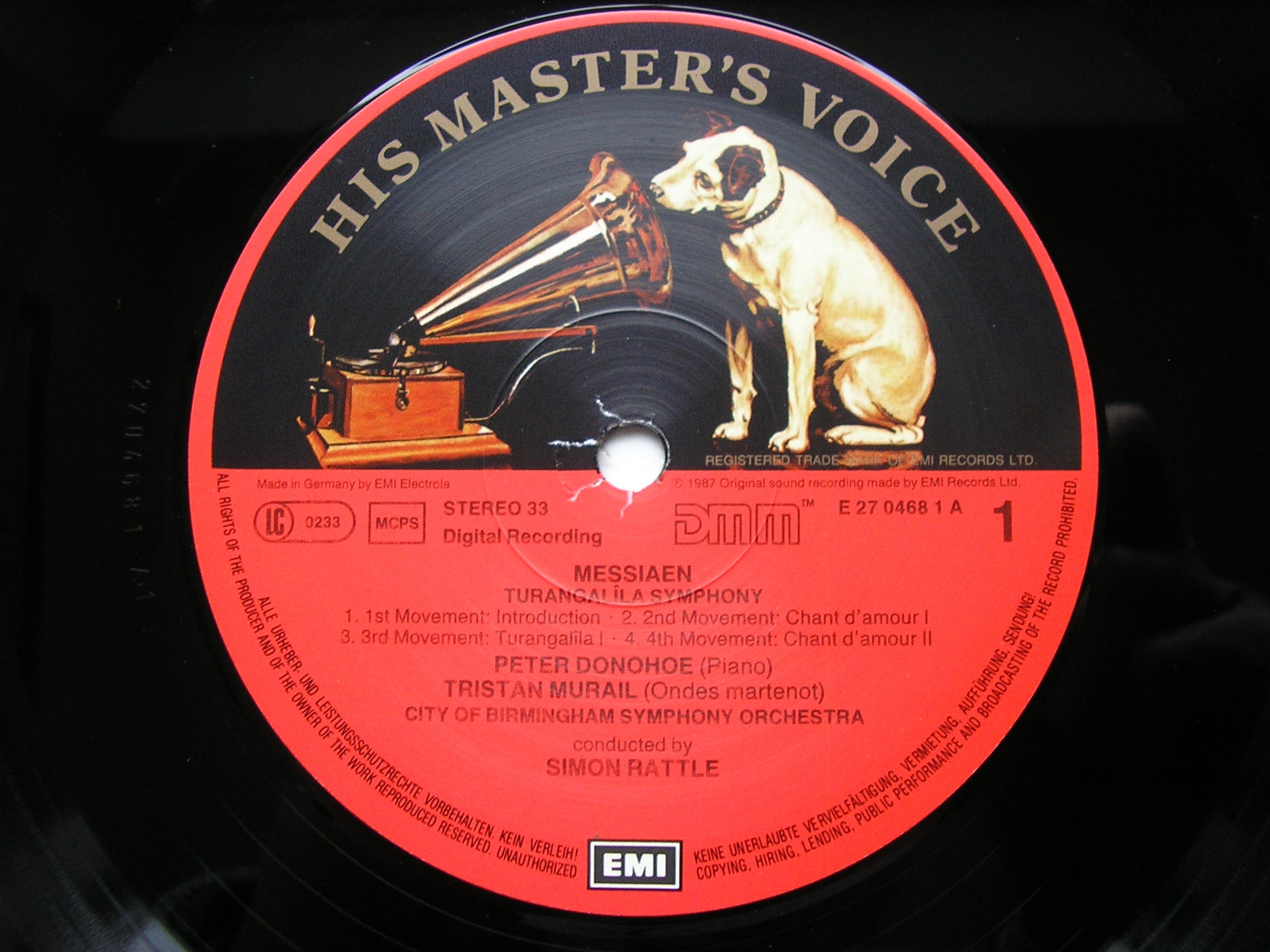 27 0468  MESSIAEN: TURANGALILA SYMPHONIE      PETER DONOHOE / TRISTAN MURAIL / CITY OF BIRMINGHAM SYMPHONY ORCHESTRA / SIMON RATTLE     *QUARTET FOR THE END OF TIME     SASCHKO GAVRILOFF / HANS DEINZER / SIEGFRIED PALM / ALOYS KONTARSKY*
