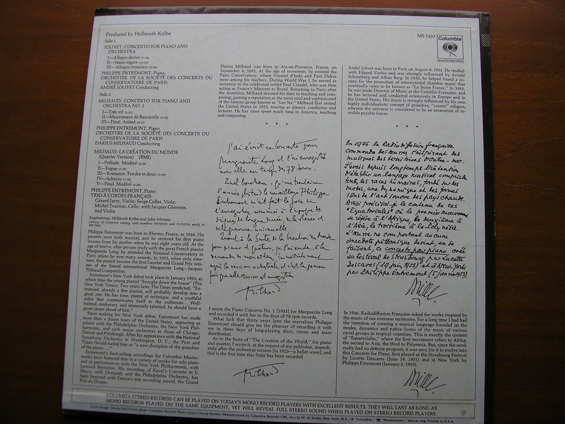 MS 7432  MILHAUD: PIANO CONCERTO No. 1 / LA CREATION DU MONDE (Quartet Version ) / JOLIVET: PIANO CONCERTO     PHILLIPE ENTREMONT / GERARD JARRY / SERGE COLLOT / MICHEL TOURNUS / PARIS CONSERVATOIRE ORCHESTRA / DARIUS MILHAUD / ANDRE JOLIVET