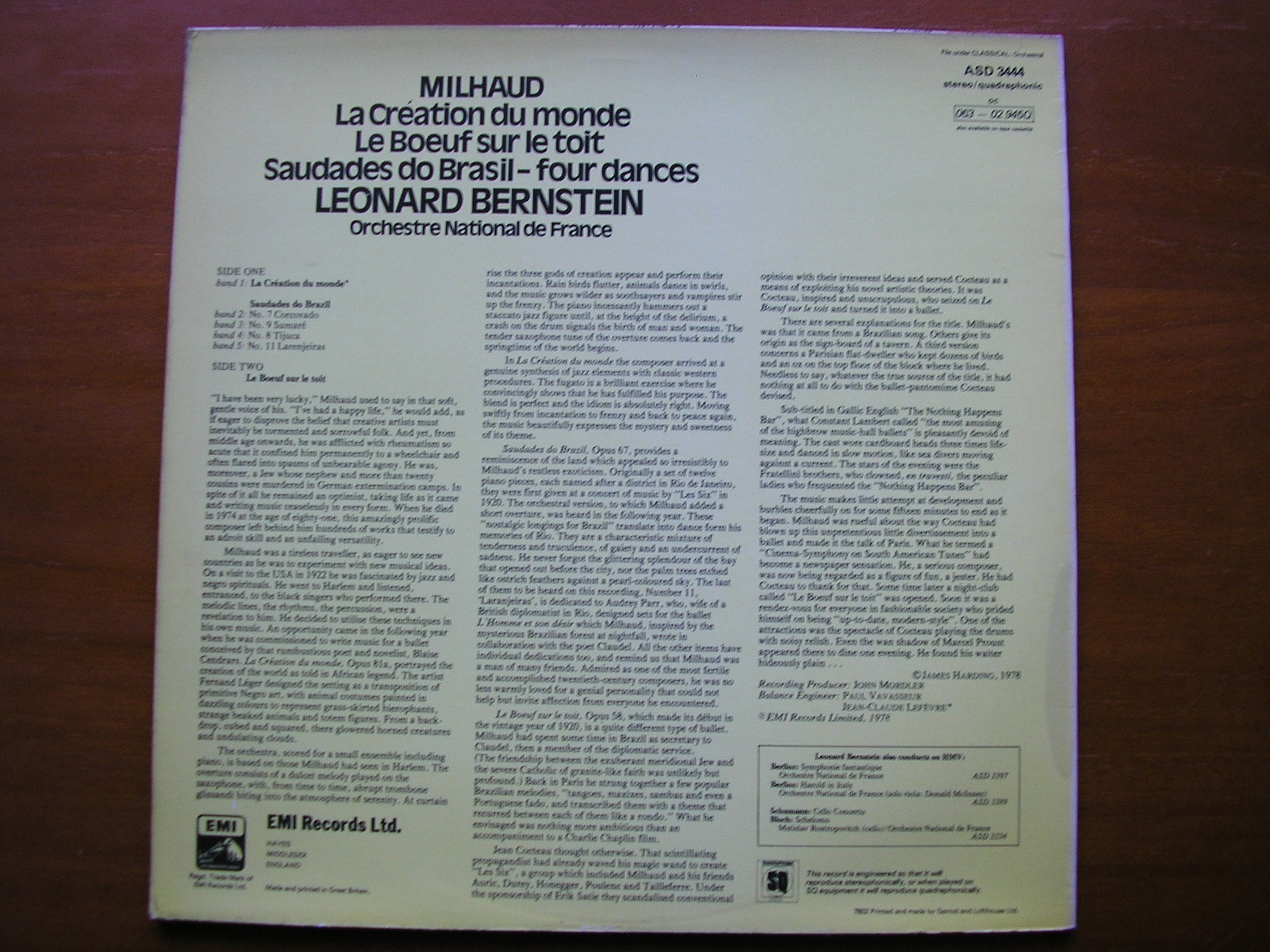 ASD 3444  MILHAUD: LA CREATION DU MONDE / LE BOUEF SUR LE TOIT / SAUDADES DO BRASIL - FOUR DANCES       LEONARD BERNSTEIN / FRENCH NATIONAL ORCHESTRA