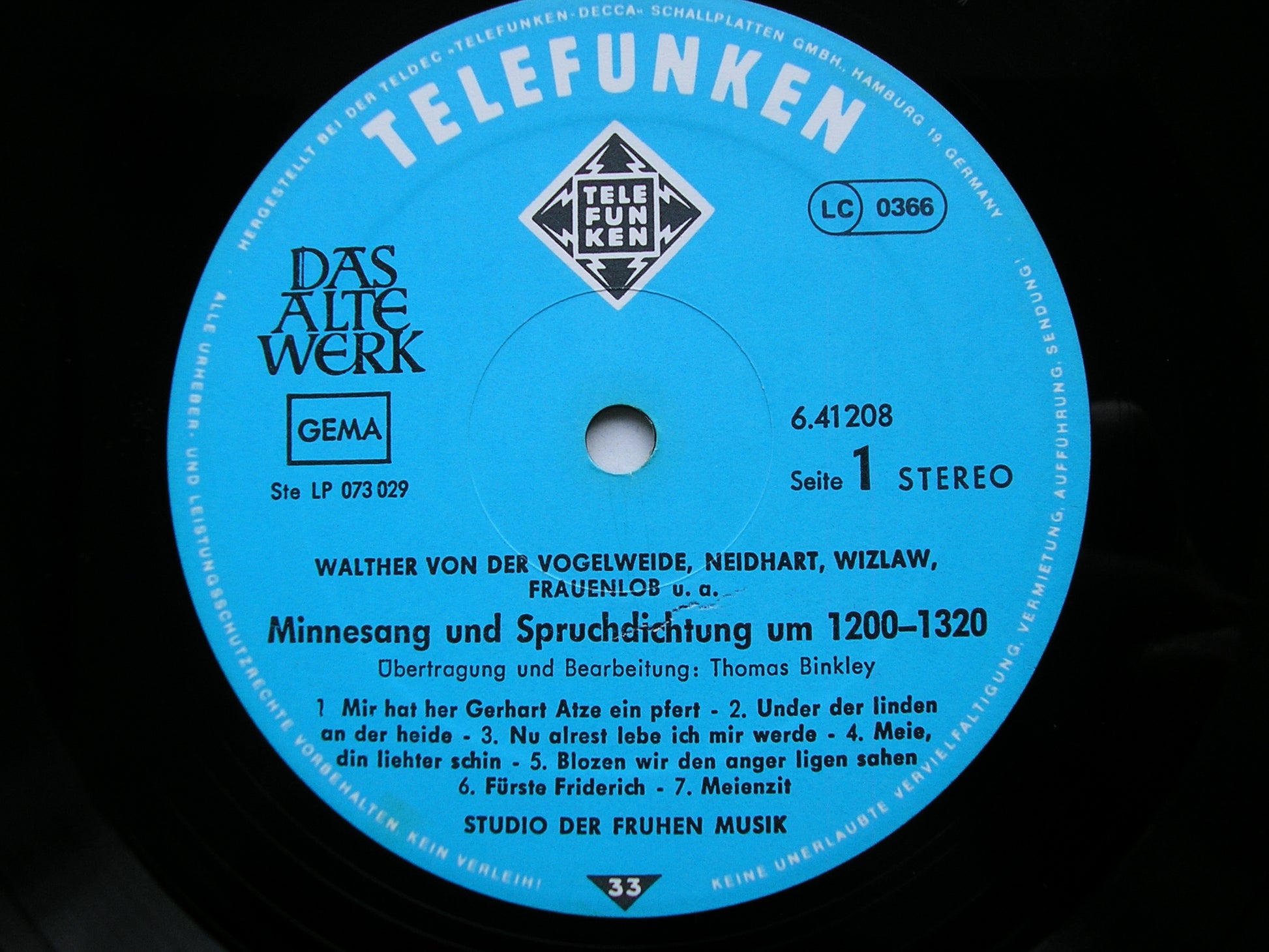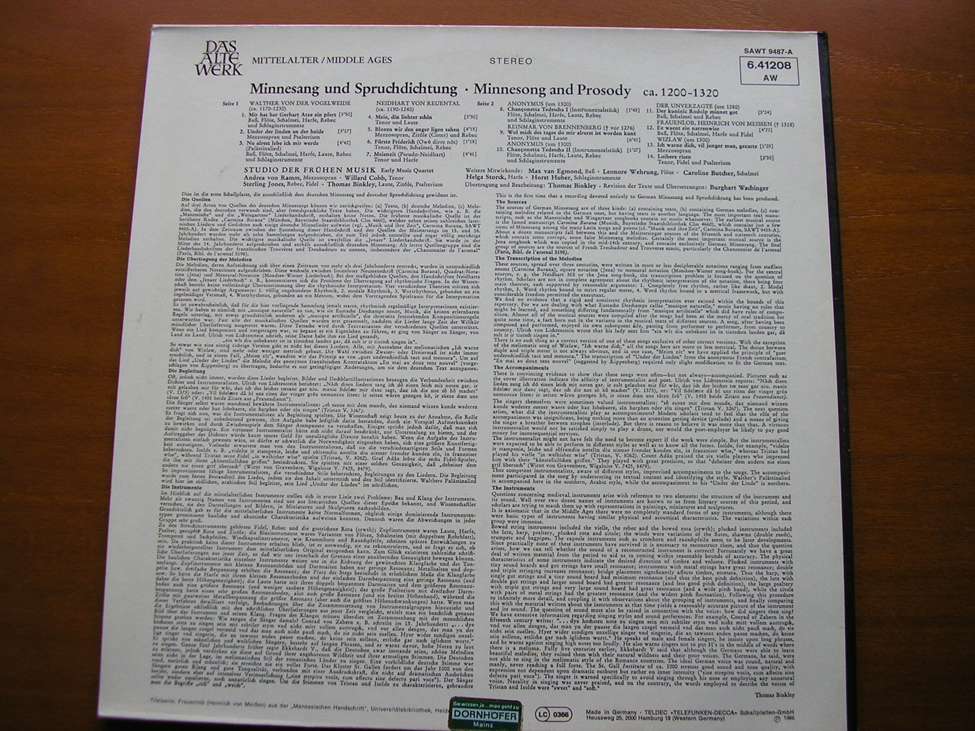 6.41208  MINNESONG & PROSODY circa 1200 - 1320: VOGELWEIDE / VON REUENTAL / VON BRENNENBERG / UNVERZAGTE / HEINRICH VON MEISSEN / WIZLAW        THE STUDIO OF EARLY MUSIC / THOMAS BINKLEY