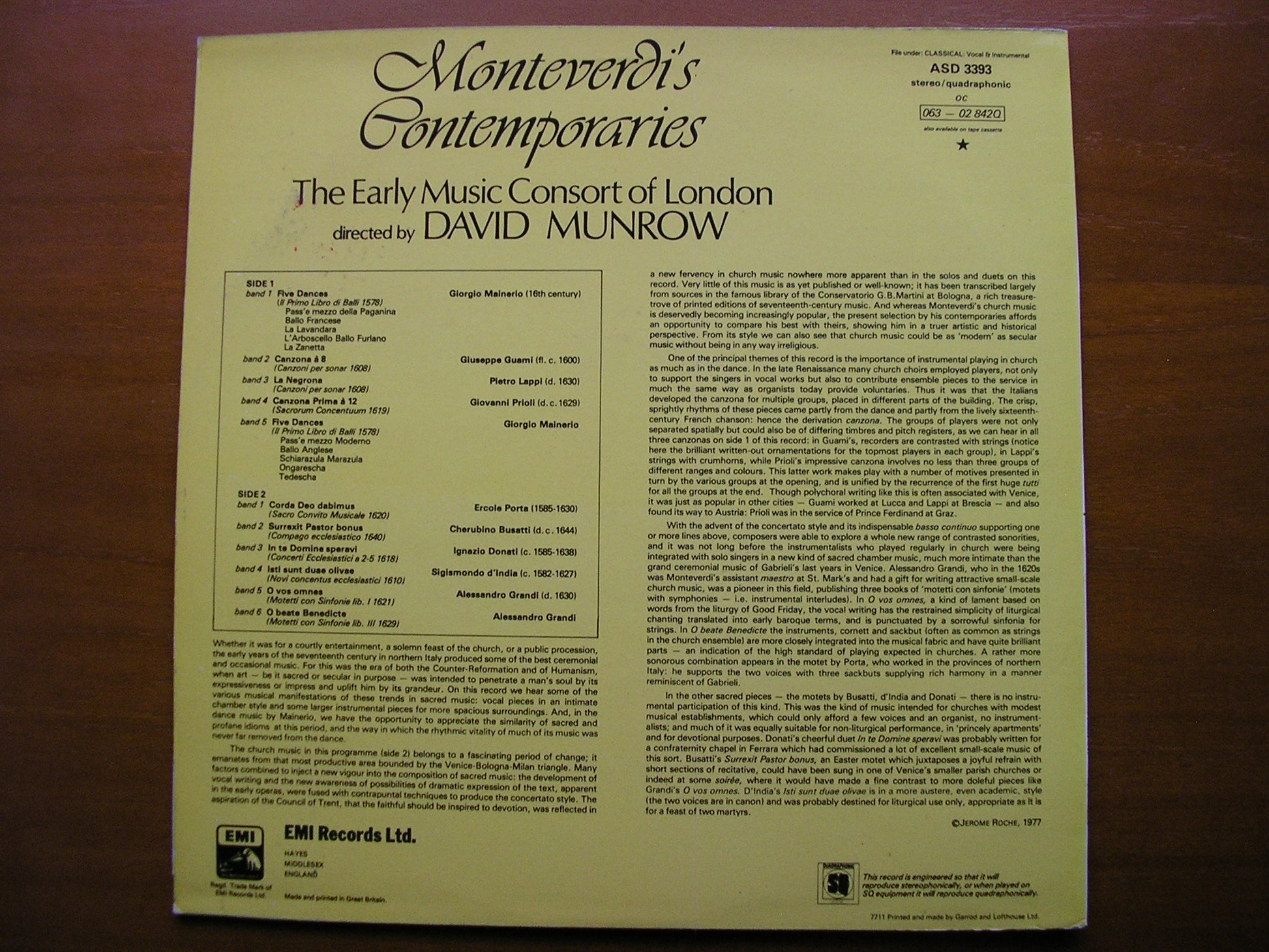 ASD 3393  MONTEVERDI'S CONTEMPORARIES: GRANDI / DONATI / GUAMI / LAPPI / PORTA / MAINERIO / d'INDIA      DAVID MUNROW / THE EARLY MUSIC CONSORT OF LONDON