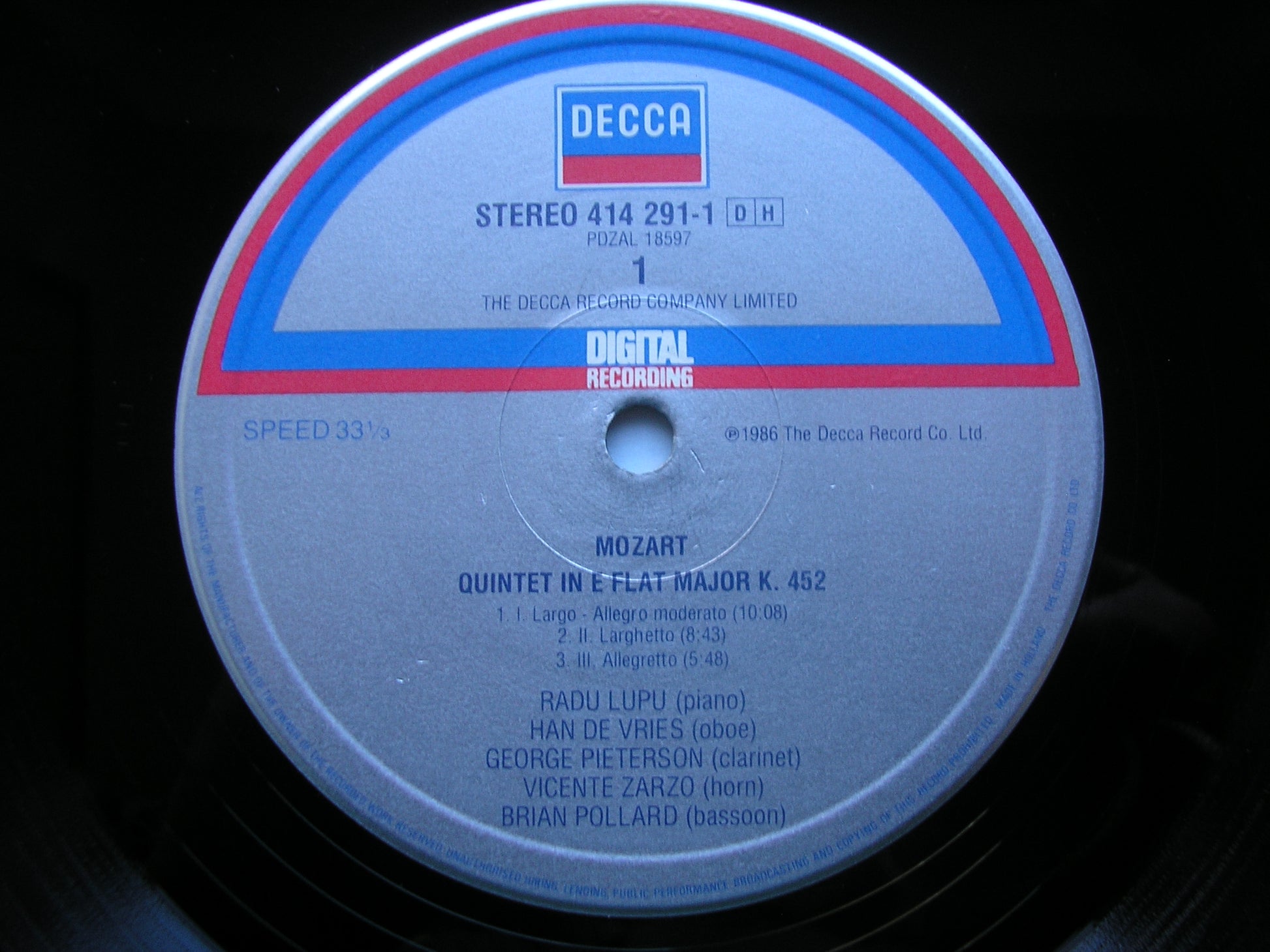 414 291  MOZART: QUINTET in E  K452 / BEETHOVEN: QUINTET Op. 16    RADU LUPU / HAN de VRIES / VICENTE ZARZO / GEORGE PIETERSEN / BRIAN POLLARD