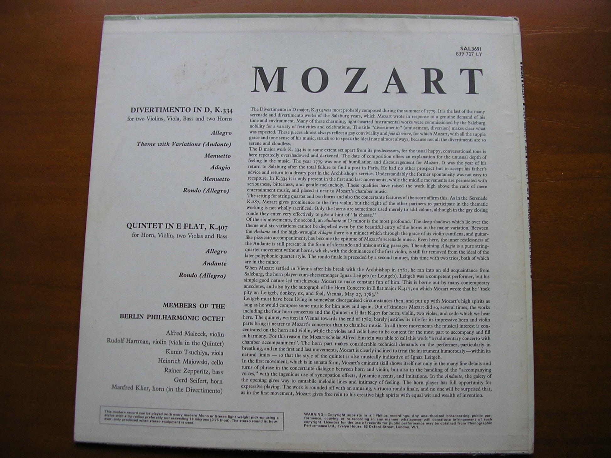 SAL 3691  MOZART: DIVERTIMENTO in D  K334 / QUINTET in E  K407     BERLIN PHILHARMONIC OCTET
