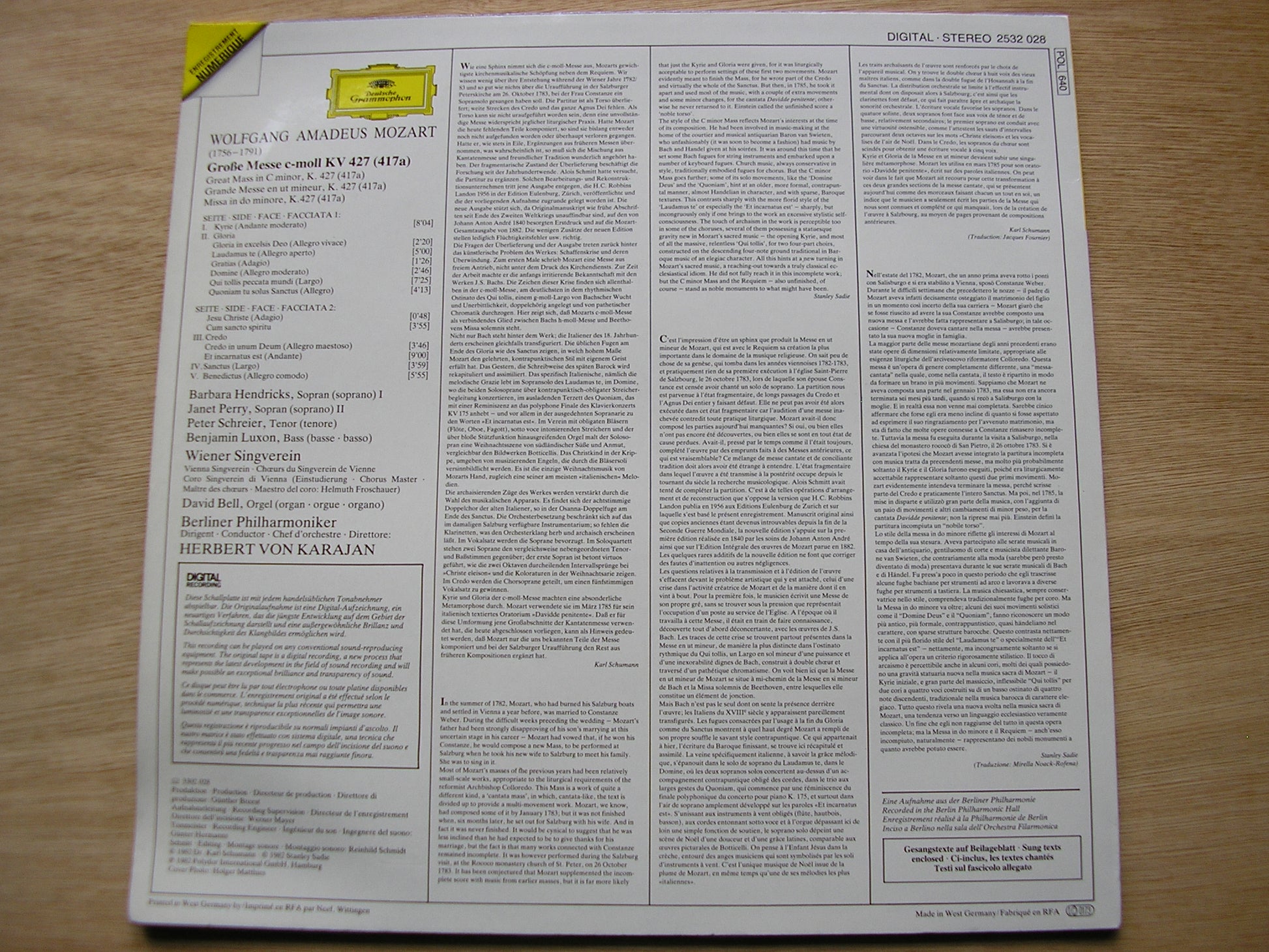 2532 028   MOZART: GREAT MASS in C Minor     BARBARA HENDRICKS / JANET PERRY / PETER SCHREIER / BENJAMIN LUXON / BERLIN PHILHARMONIC ORCHESTRA / HERBERT VON KARAJAN