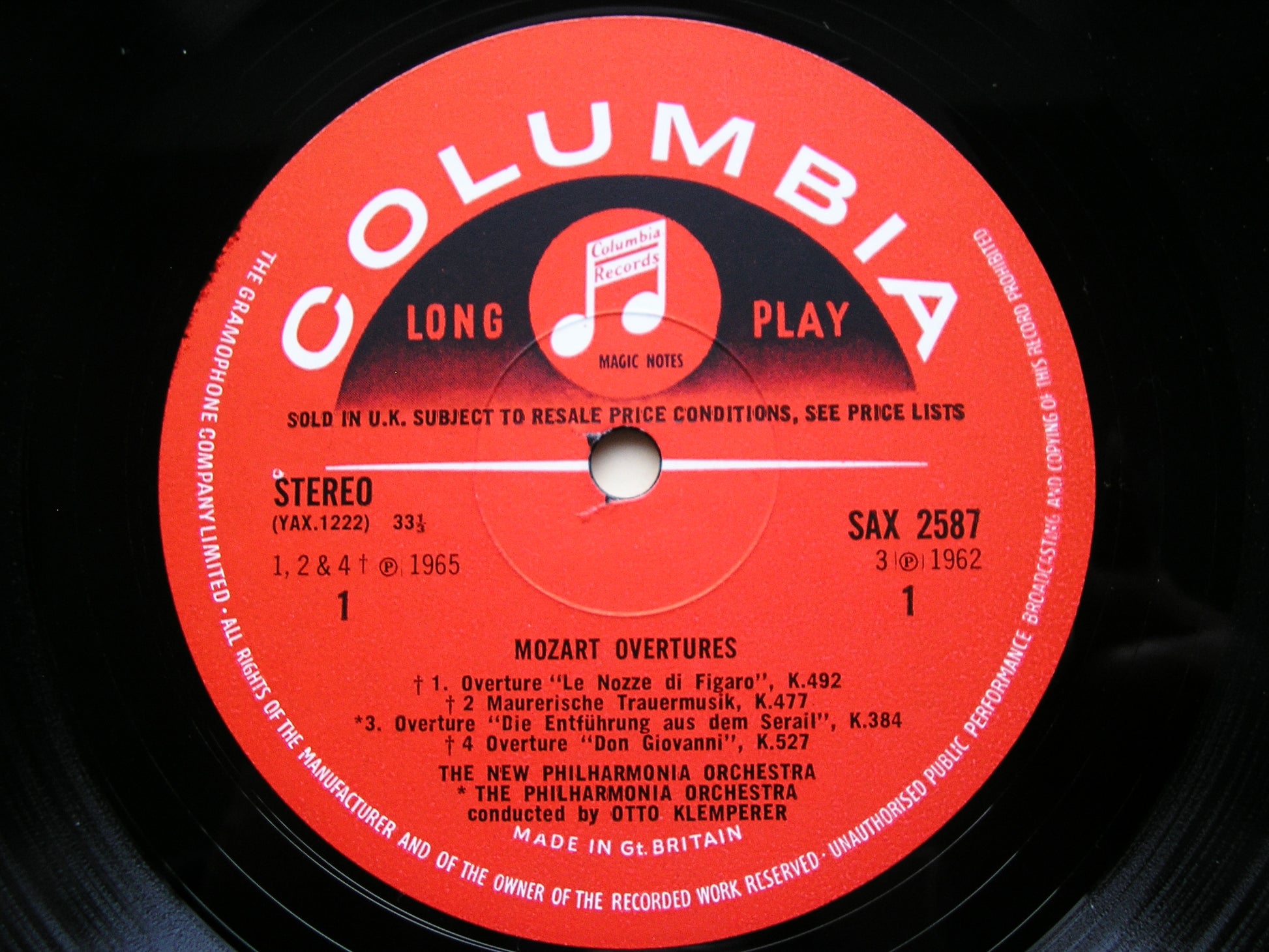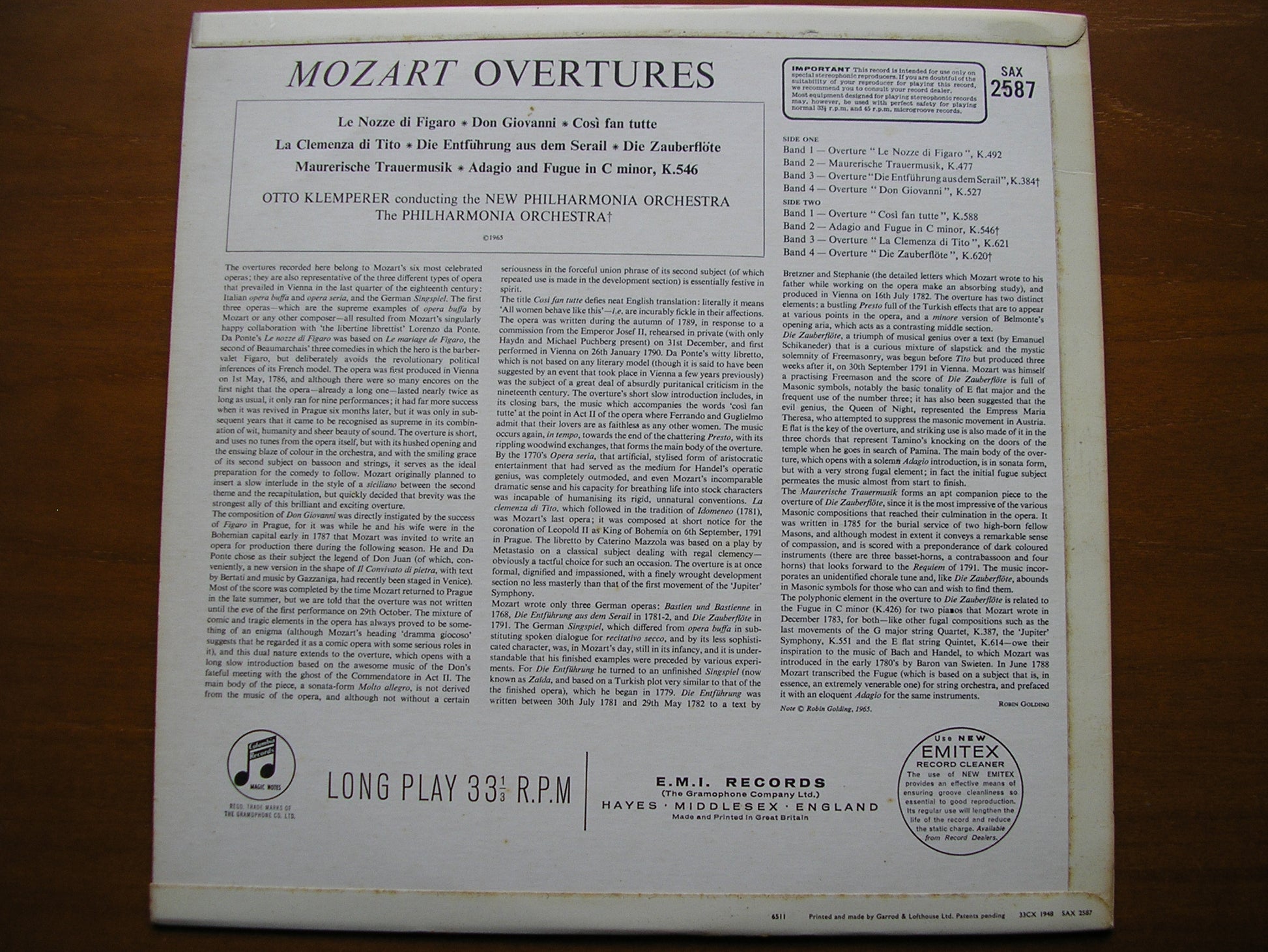 SAX 2587  MOZART: SIX OVERTURES / MASONIC FUNERAL MUSIC / ADAGIO & FUGUE K546 OTTO KLEMPERER / PHILHARMONIA / NEW PHILHARMONIA ORCHESTRA