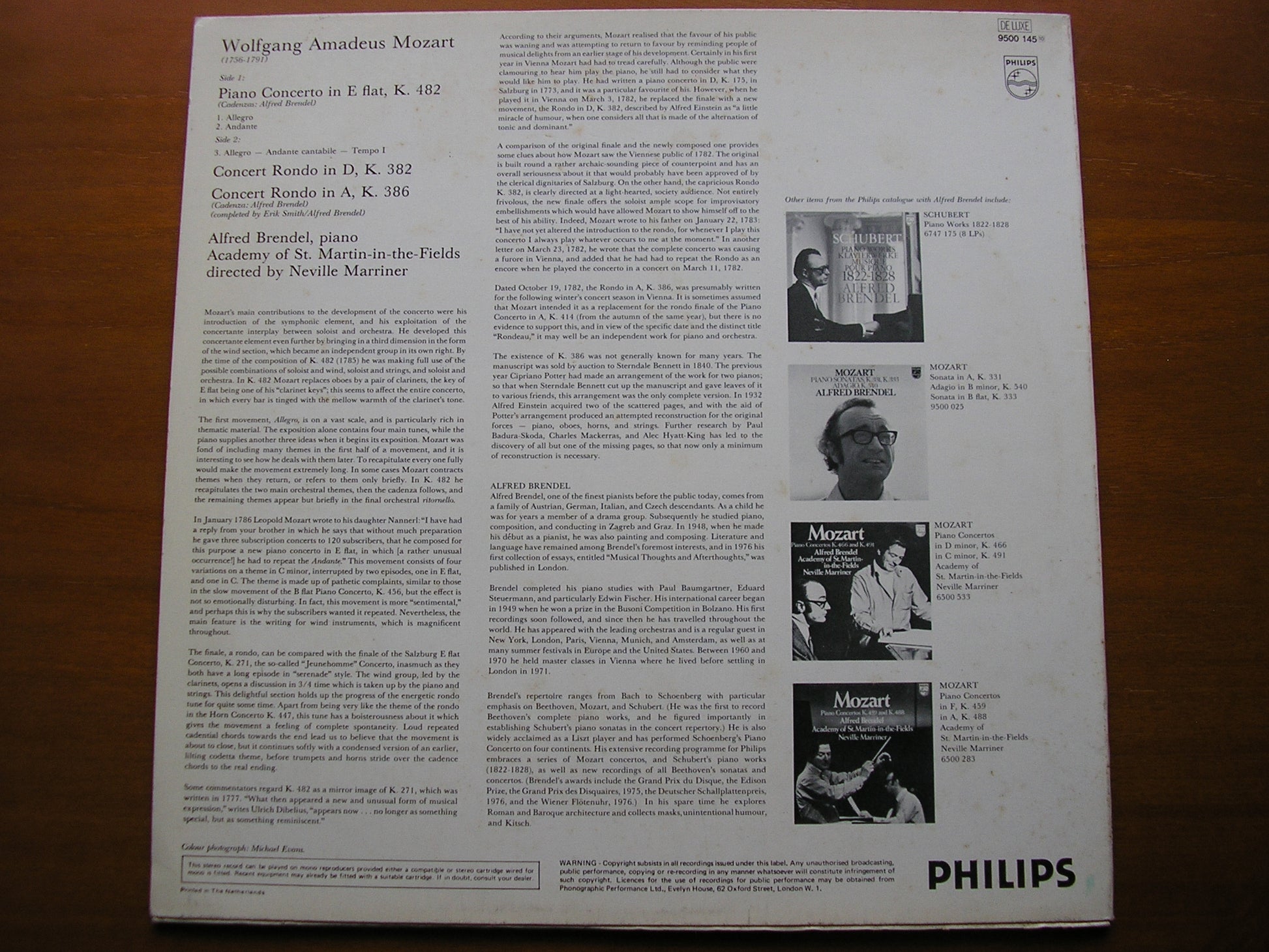 9500 145  MOZART: PIANO CONCERTO K482 / RONDOS K382 & K386      ALFRED BRENDEL / ACADEMY OF ST MARTIN IN THE FIELDS / NEVILLE MARRINER
