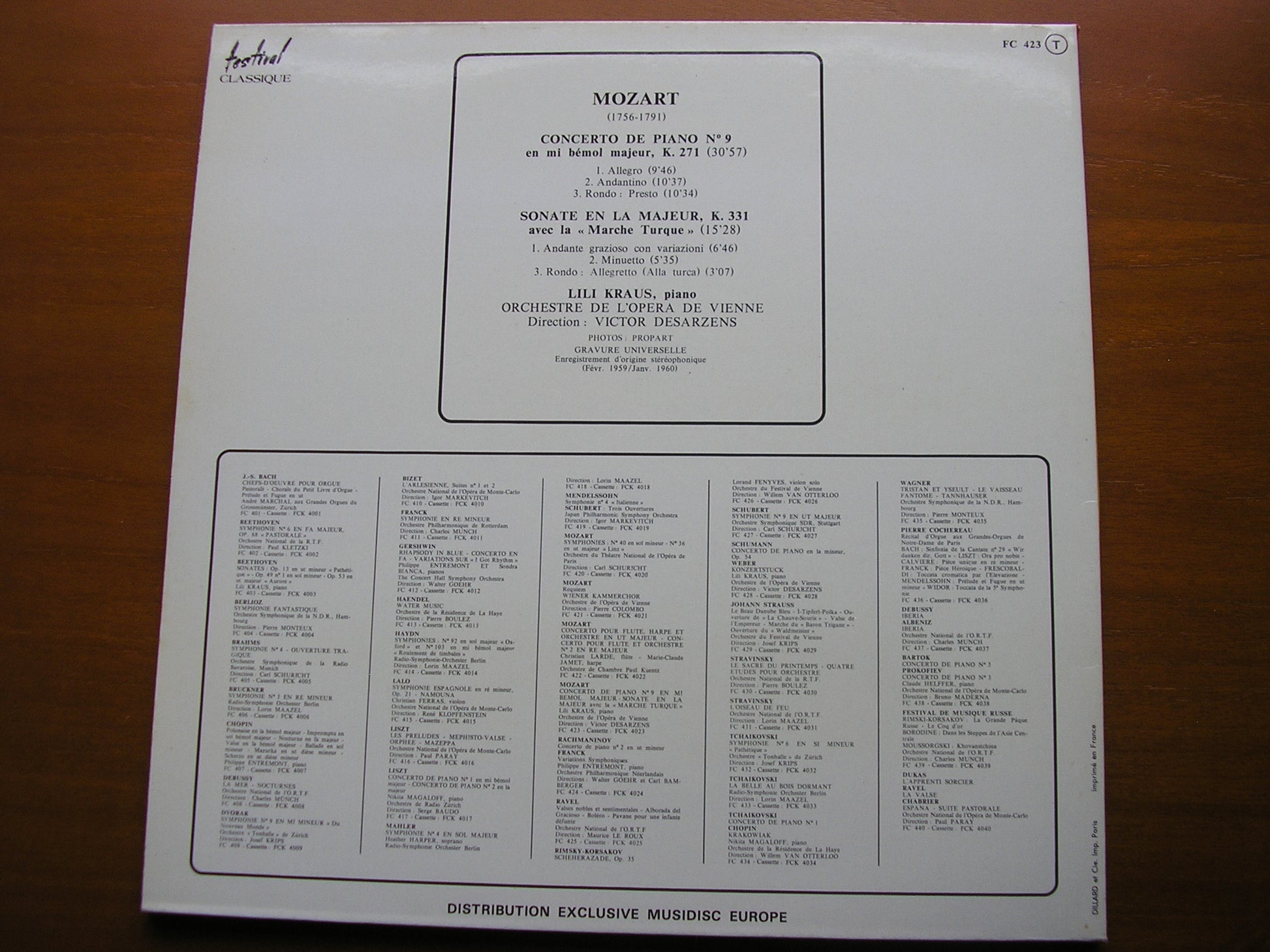 FC 423  MOZART: PIANO CONCERTO K271 / SONATA K331     LILI KRAUS / VIENNA OPERA ORCHESTRA / VICTOR DESARZENS