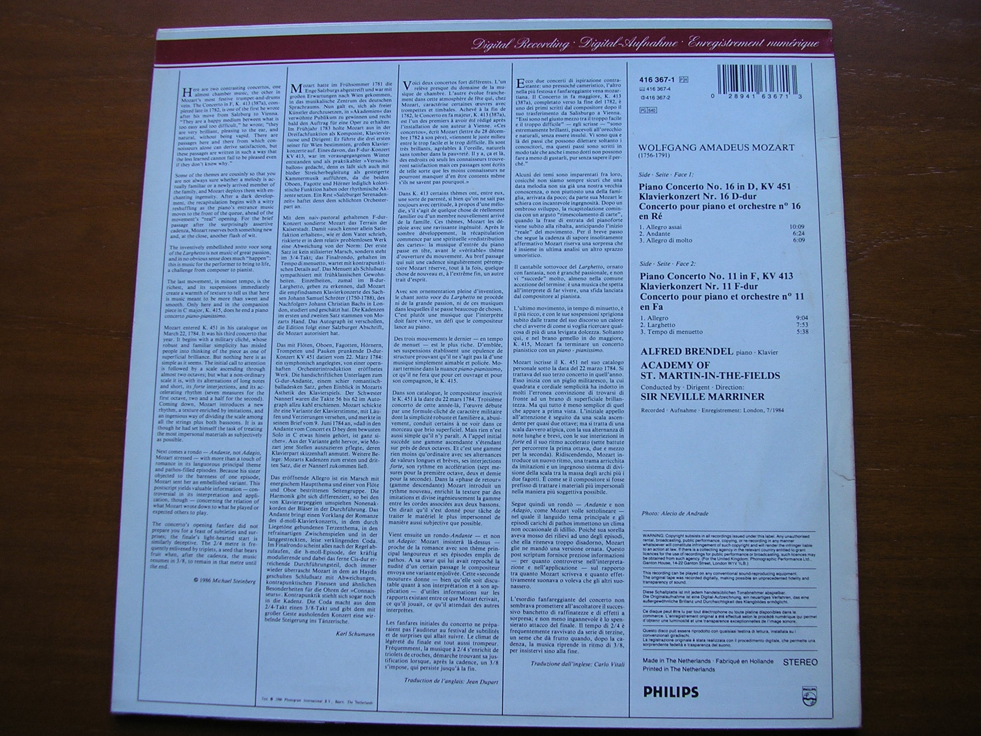 416 367  MOZART: PIANO CONCERTOS Nos. 11 K413 and 16 K451   ALFRED BRENDEL / ACADEMY OF ST MARTIN IN THE FIELDS / NEVILLE MARRINER