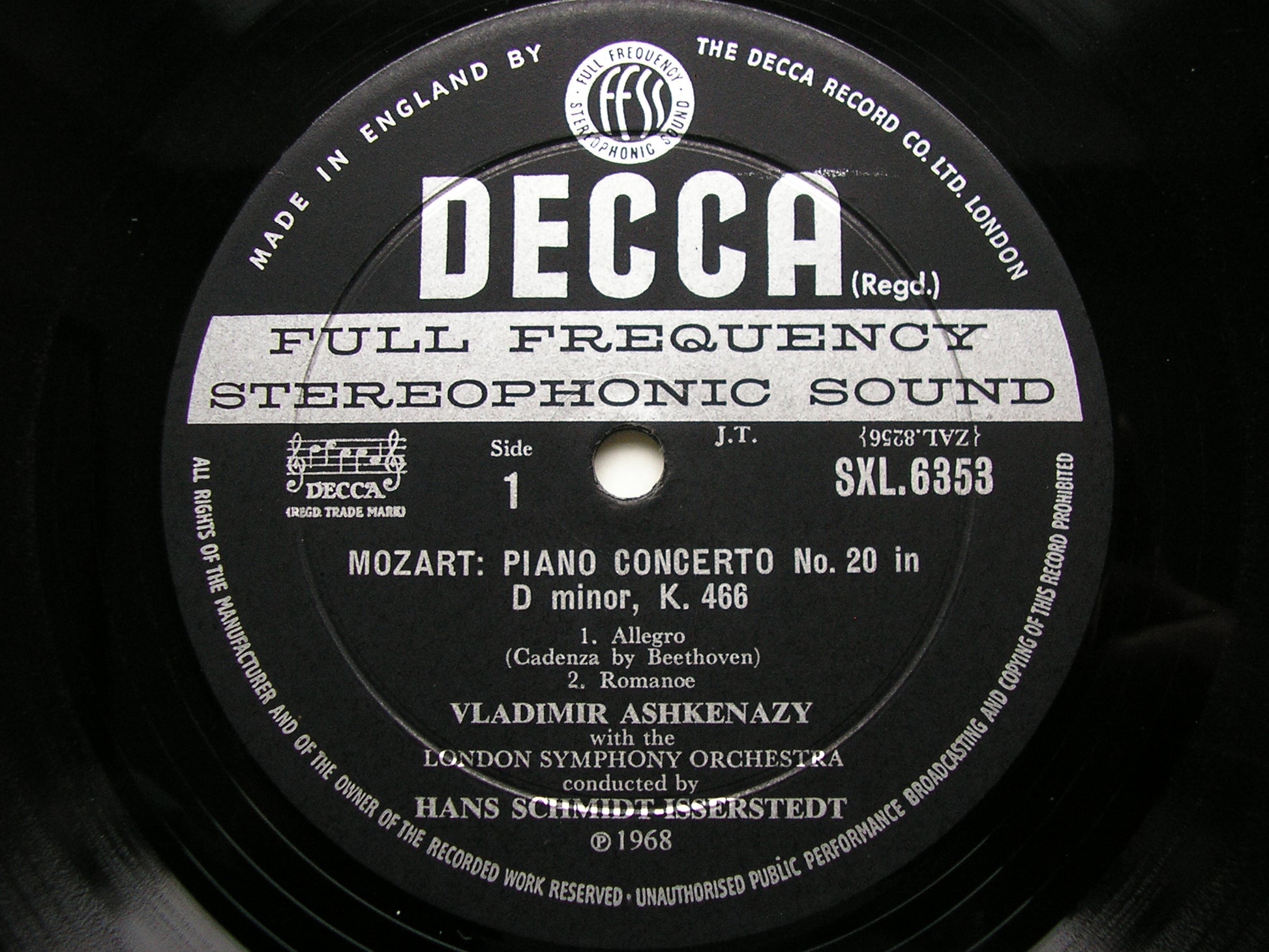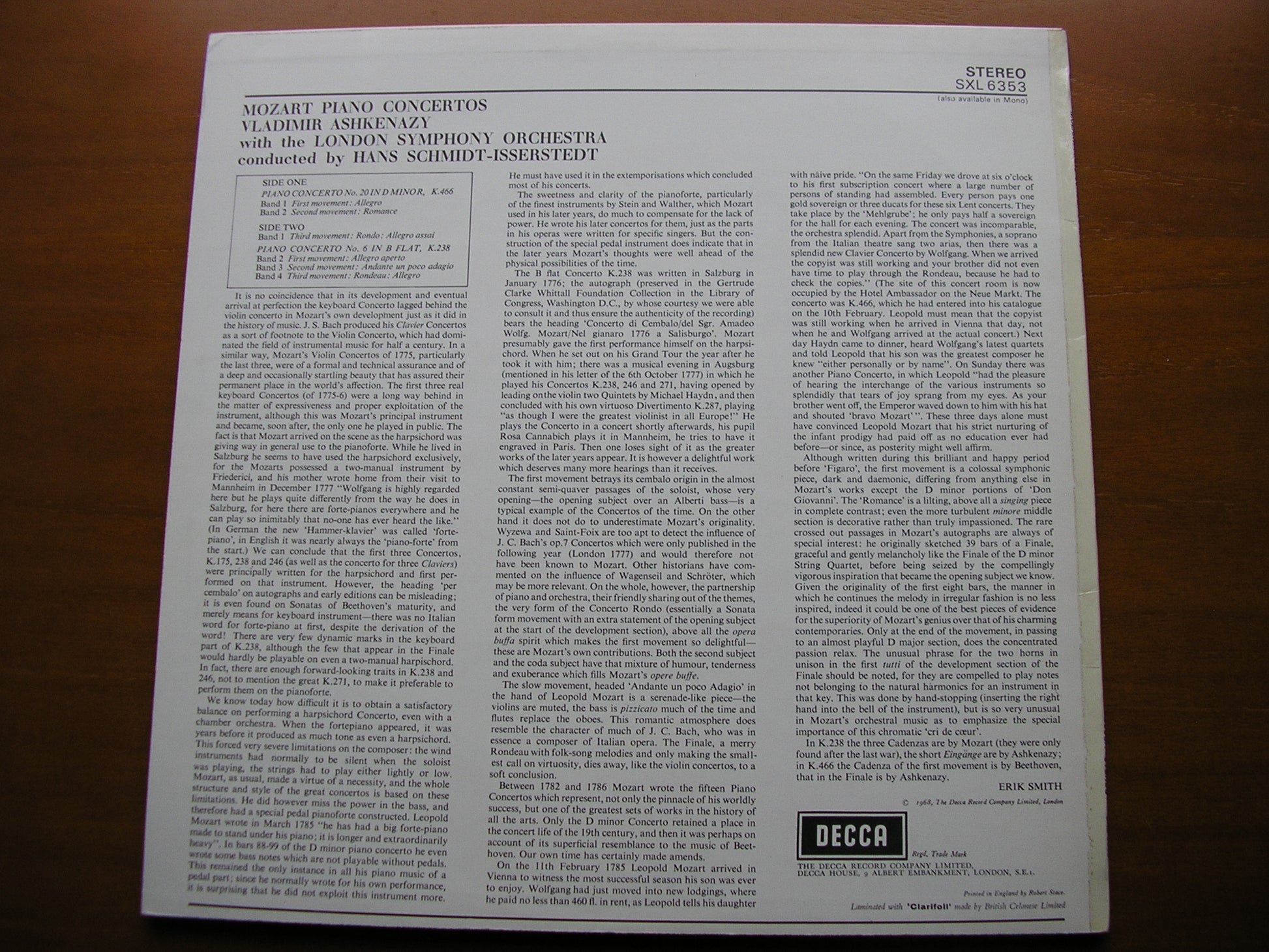 SXL 6353  MOZART: PIANO CONCERTOS K466 & K238      VLADIMIR ASHKENAZY / LONDON SYMPHONY ORCHESTRA / HANS SCHMIDT-ISSERSTEDT