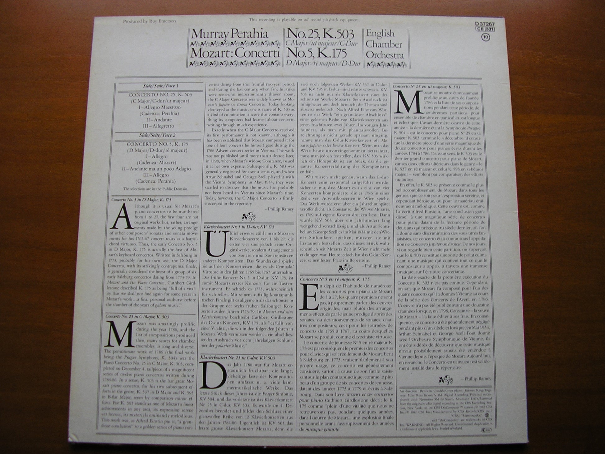 D 37267  MOZART: PIANO CONCERTOS K503 & K175     MURRAY PERAHIA / ENGLISH CHAMBER ORCHESTRA