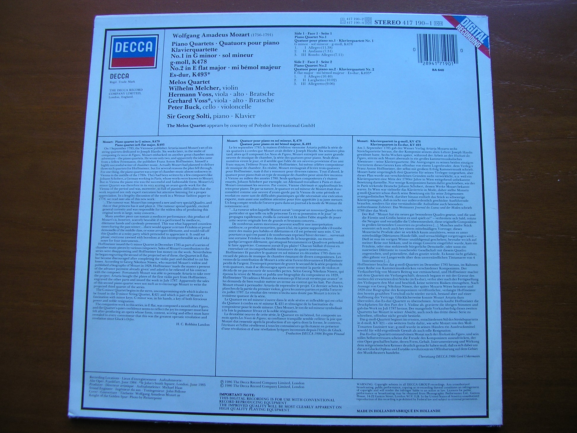 417 190  MOZART: PIANO QUARTETS K478 & K493      GEORG SOLTI / MELOS QUARTET