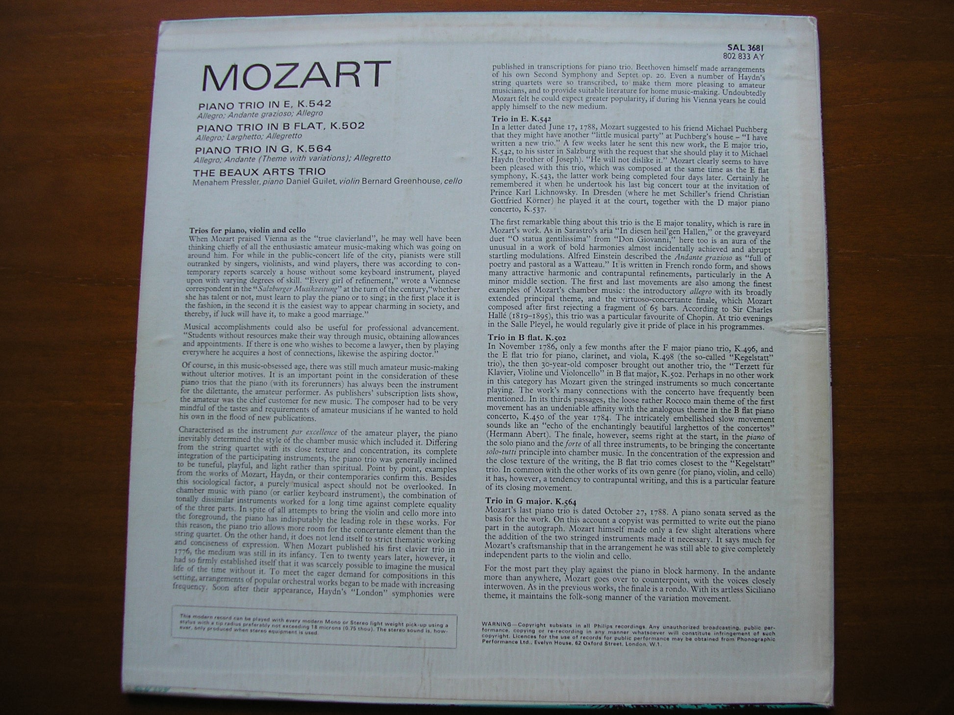 SAL 3681 MOZART: PIANO TRIOS K502 in B / K542 in E  / K564 in G            THE BEAUX ARTS TRIO