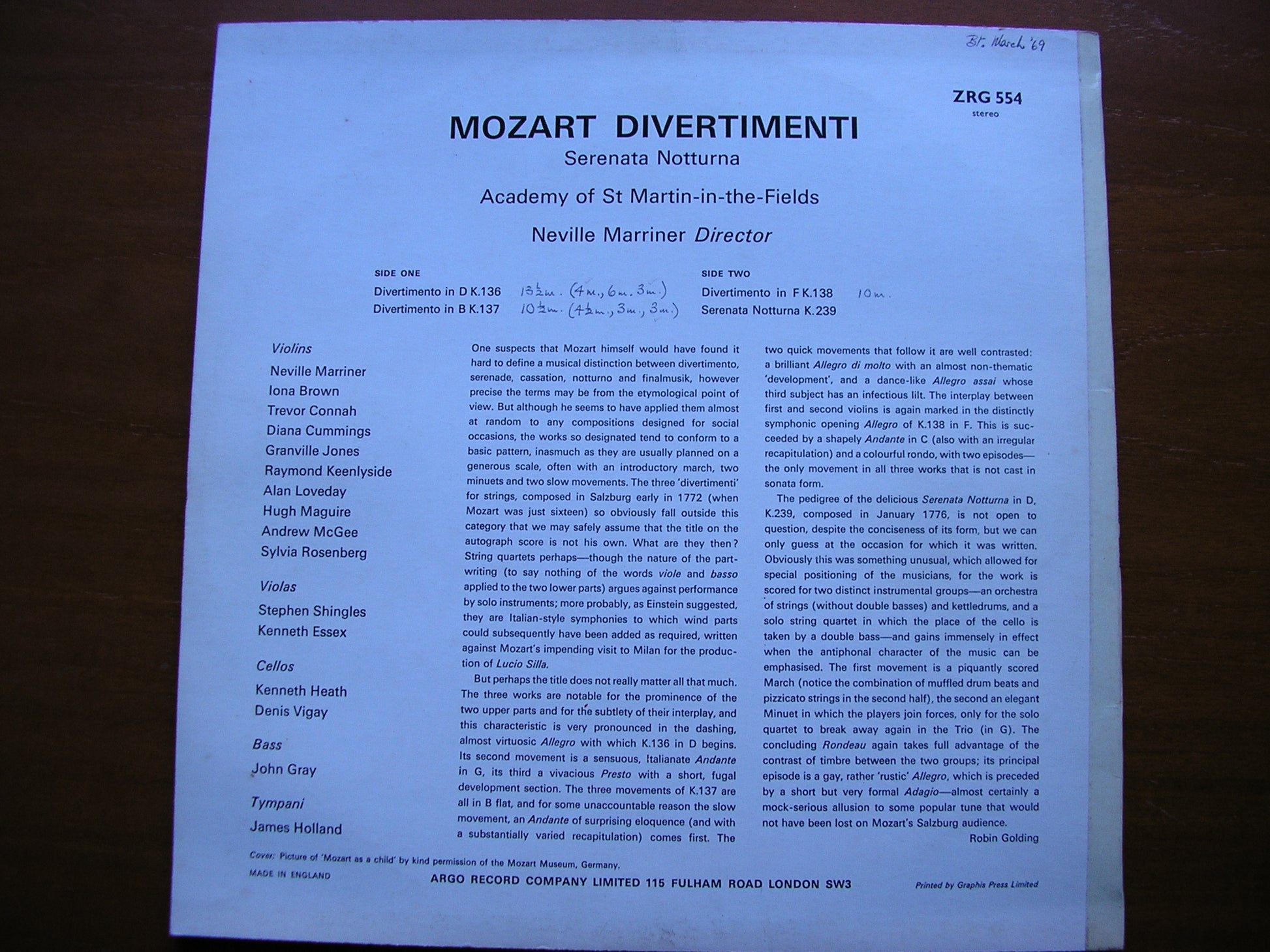 ZRG 554  MOZART: DIVERTIMENTI K136 - 138 / SERENATA NOTTURNA    NEVILLE MARRINER / ACADEMY OF ST MARTINS IN THE FIELDS