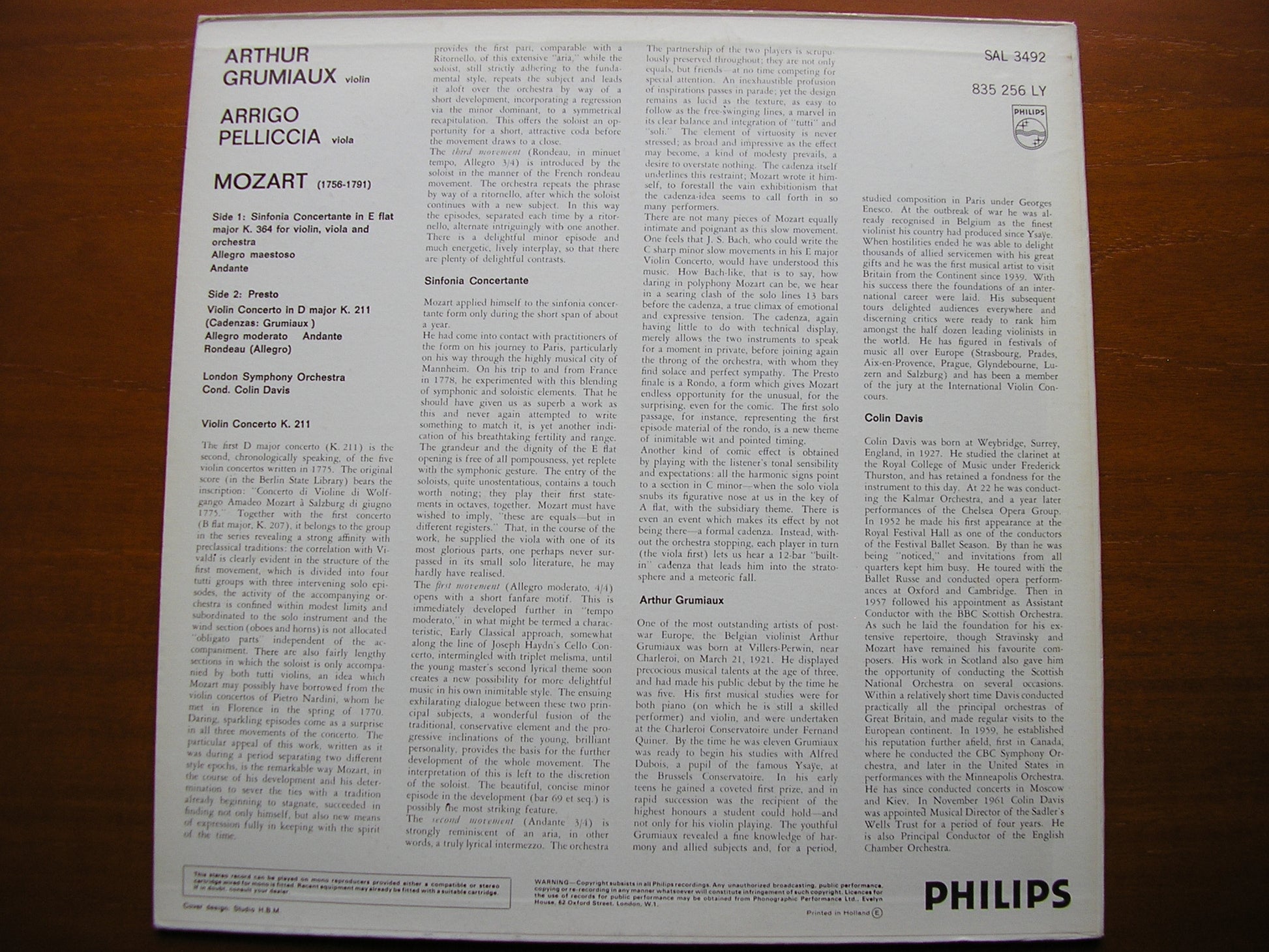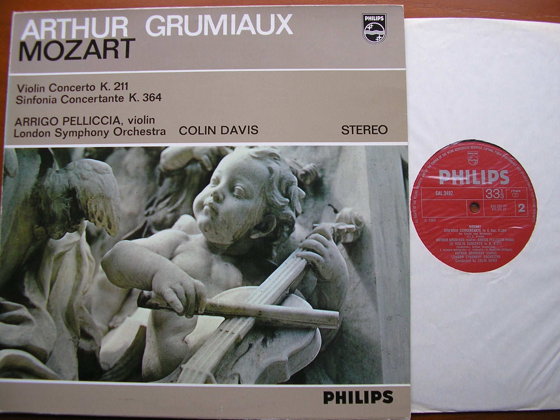SAL 3492 MOZART: VIOLIN CONCERTO K211 / SINFONIA CONCERTANTE K364 ARTHUR GRUMIAUX / ARRIGO PELLICCIA / LONDON SYMPHONY ORCHESTRA  / COLIN DAVIS
